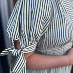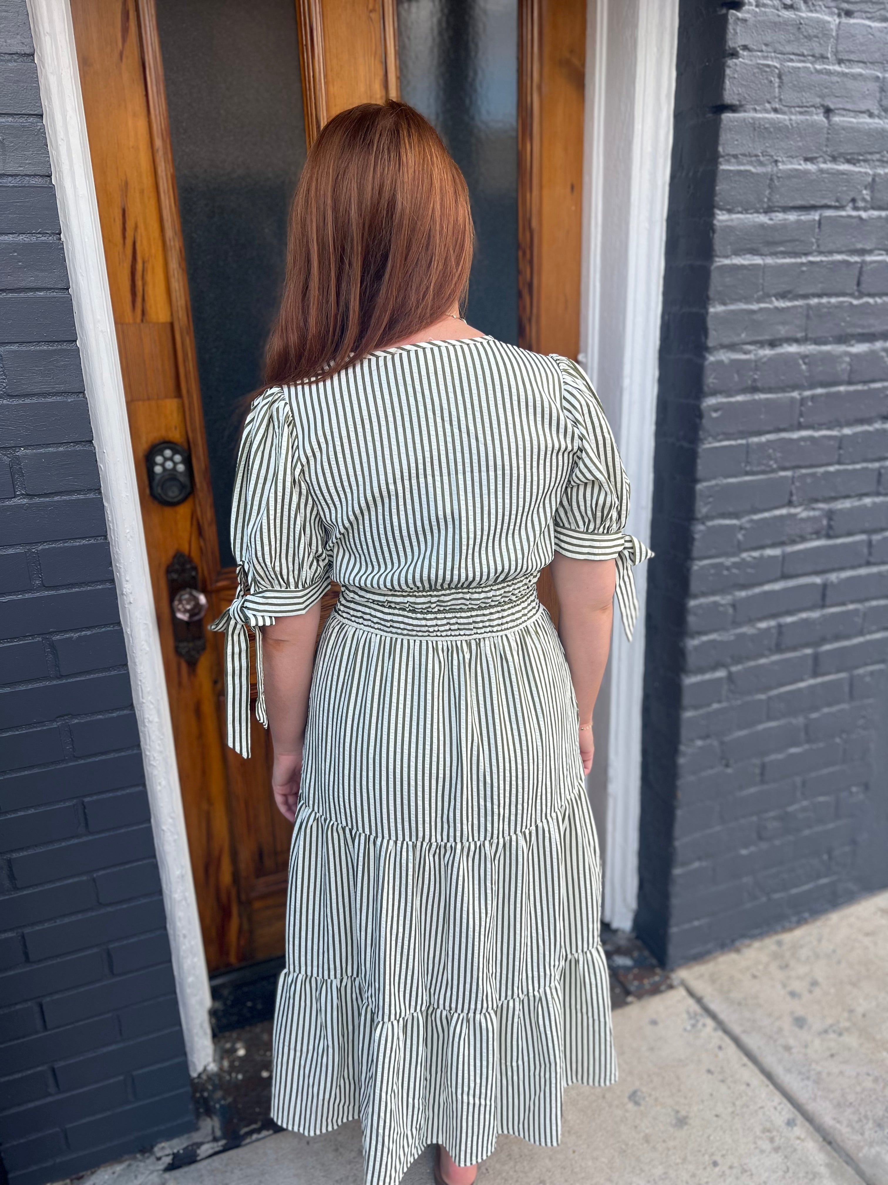 Elevate your wardrobe with this short-sleeve woven midi dress in a chic olive stripe. Featuring a comfortable elastic waistband and handy pockets, it offers both style and practicality. The V-neck with hidden button closures adds a sleek, polished look perfect for any occasion.
