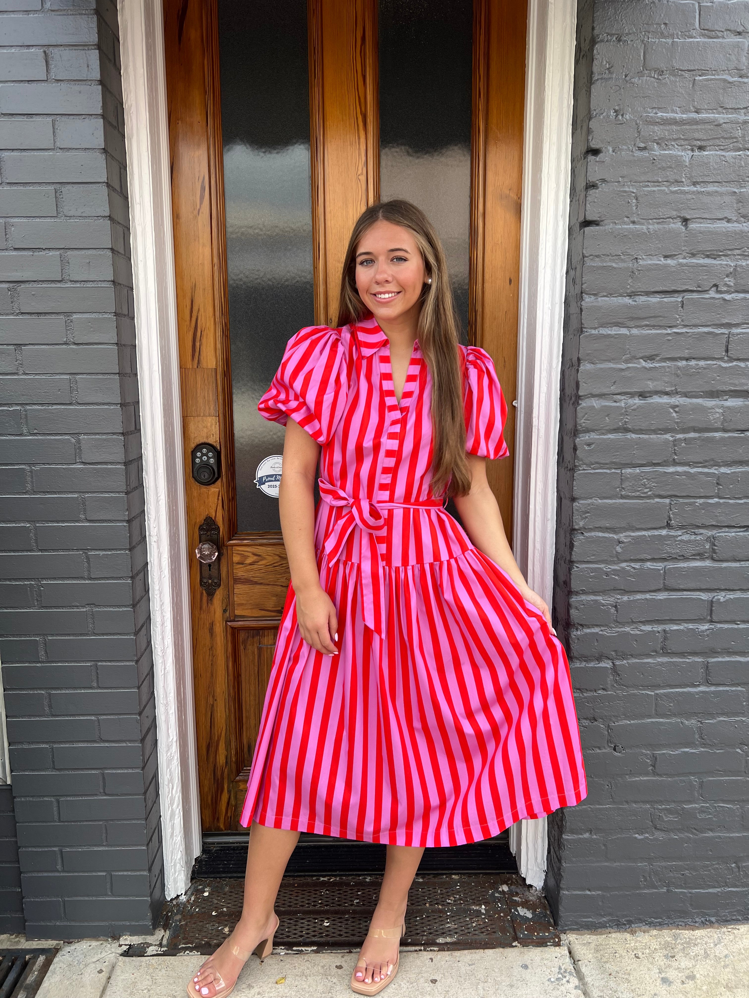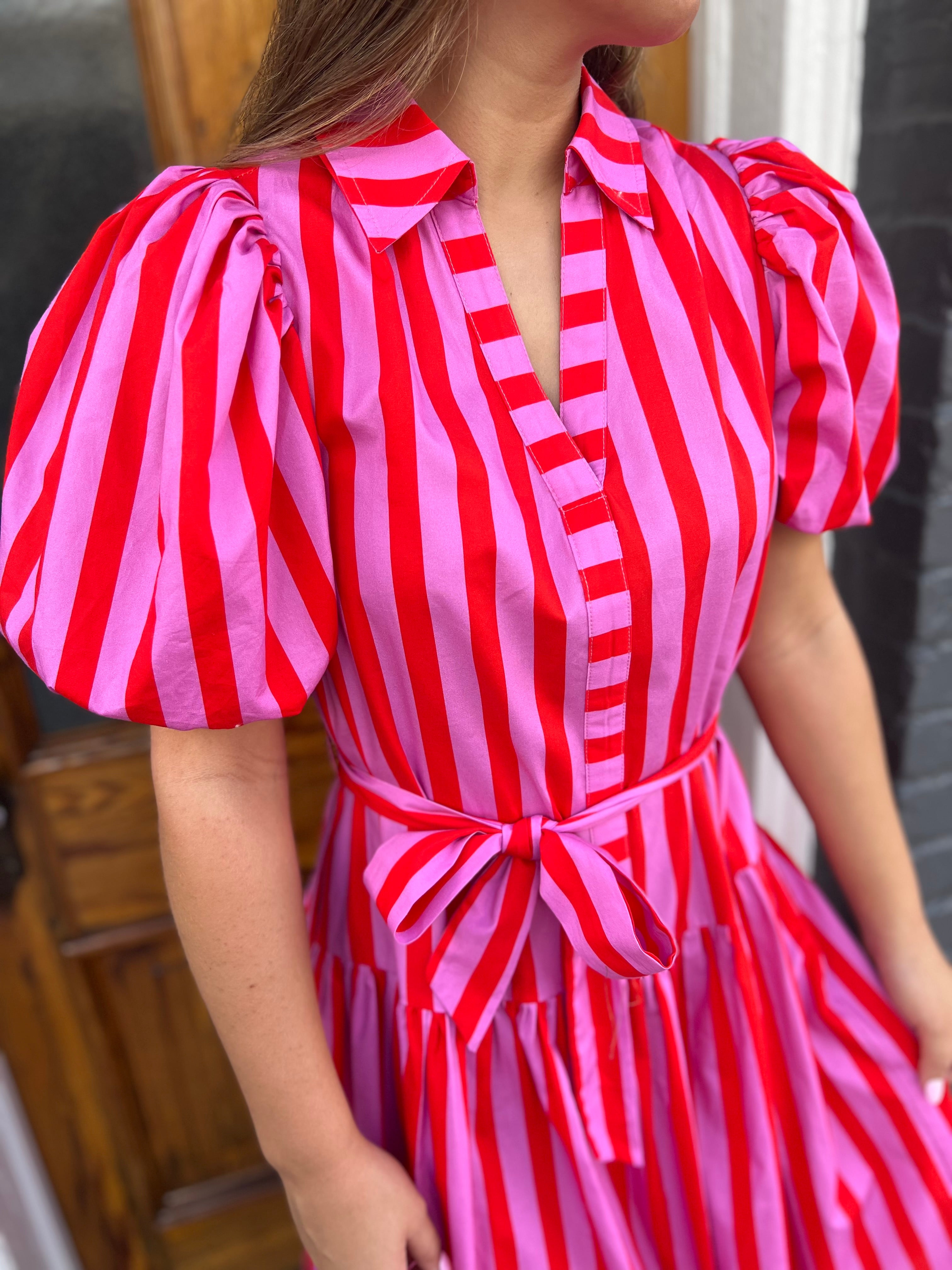 STRIPED BALLOON SLEEVE MIDI - PNK/RED