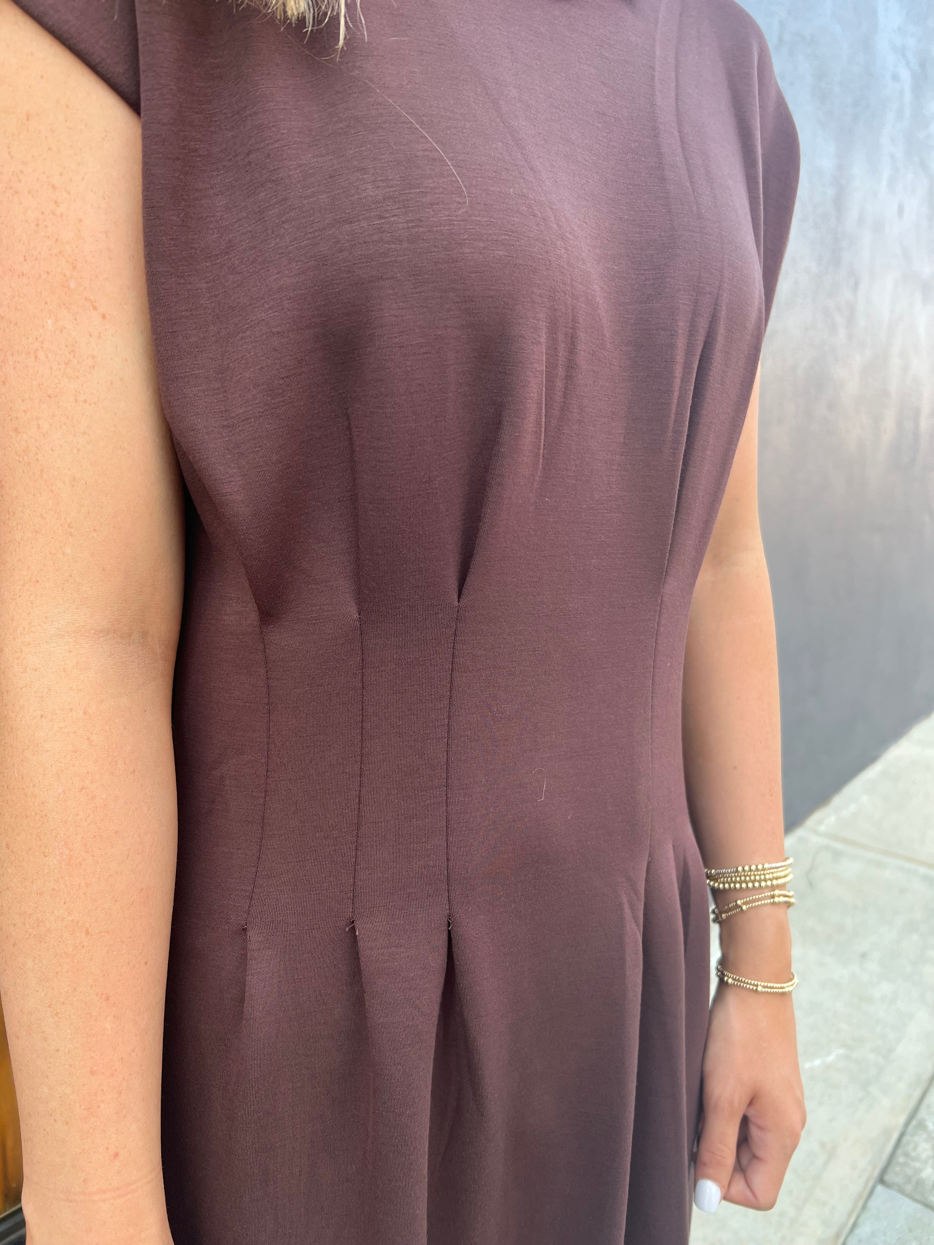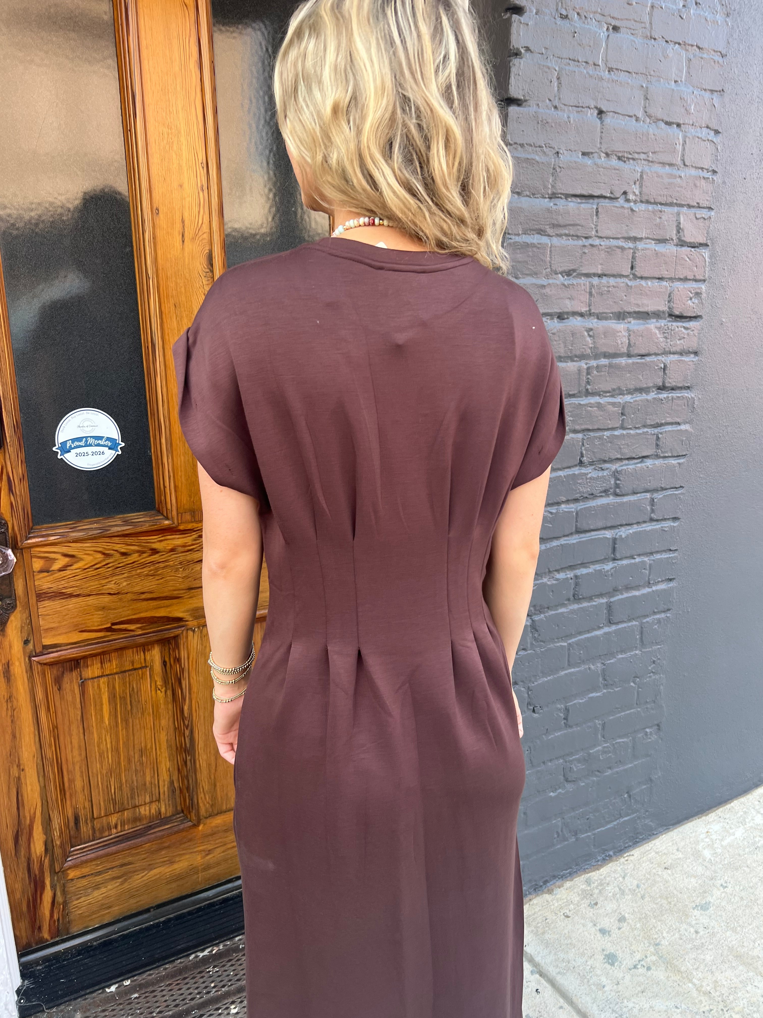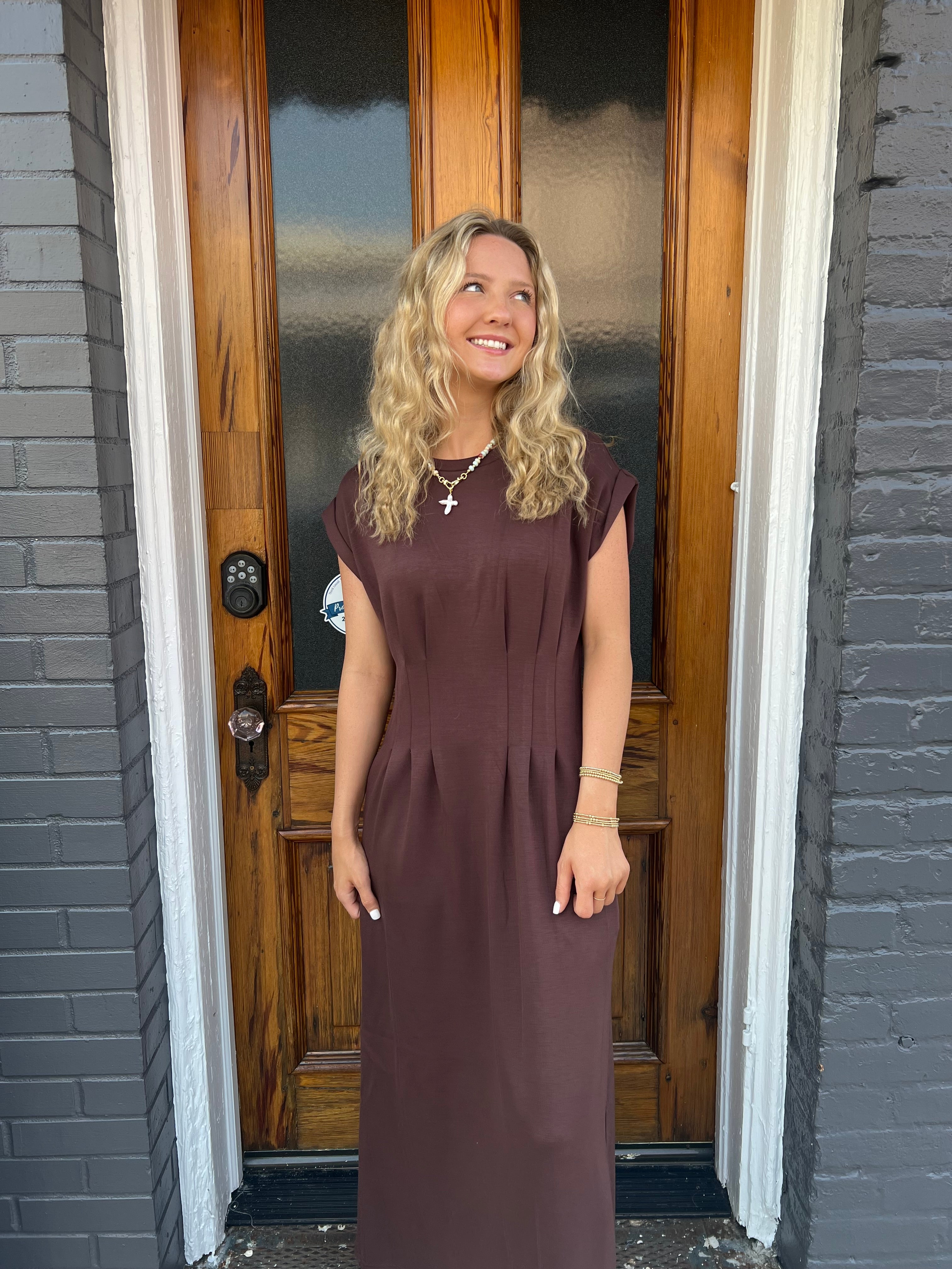The Kimber Dress in Brown offers a flattering midi silhouette with solid cap sleeves and an elegant round neckline. Its front and back pleated bodice enhances shape and comfort, while practical side pockets add everyday convenience. Crafted from a lightweight, non-sheer knit fabric and unlined for breathable wear, this dress combines style and ease, making it perfect for any occasion.