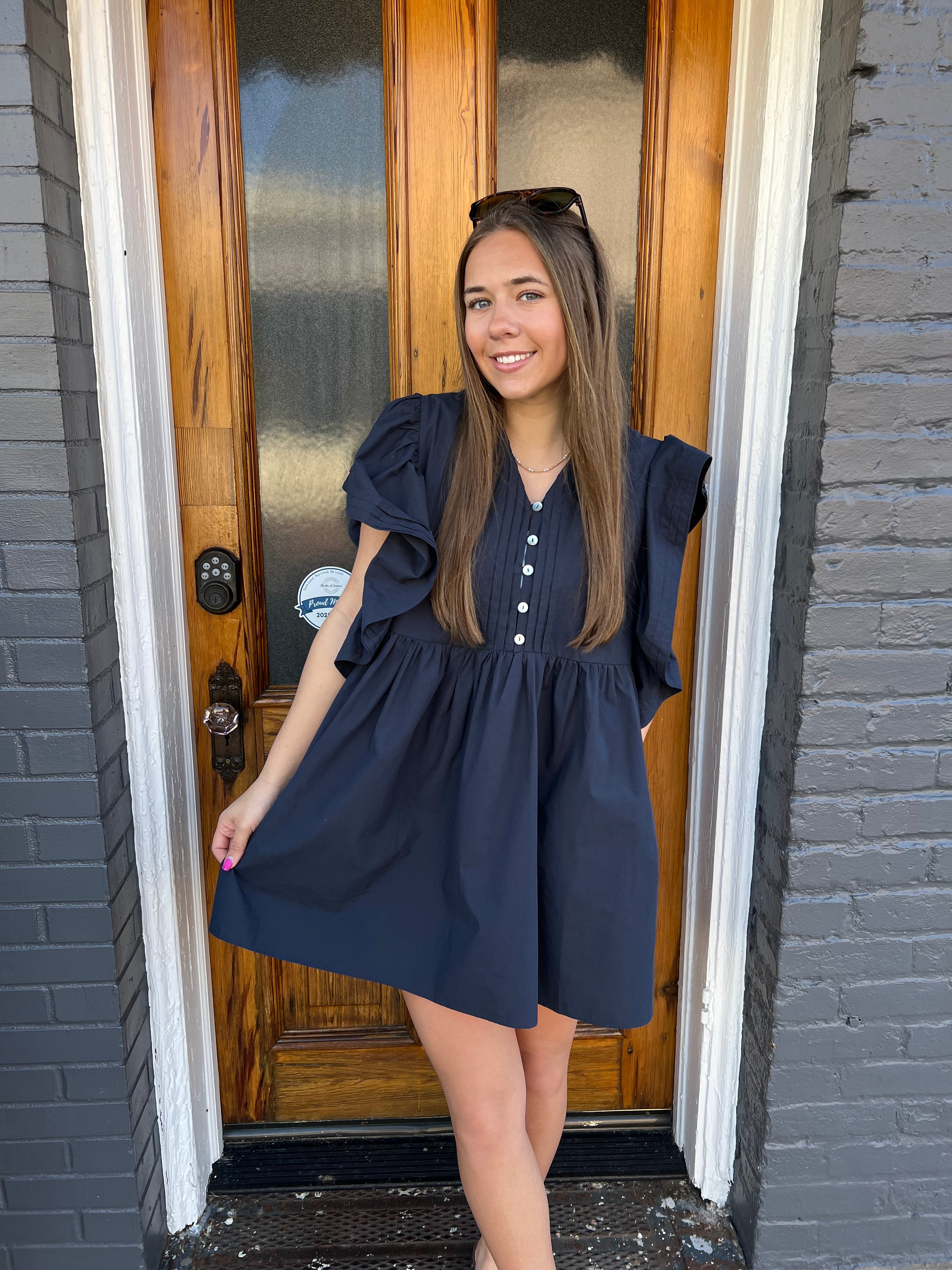 RUFFLE SLEEVE PINTUCK DRESS - NAVY