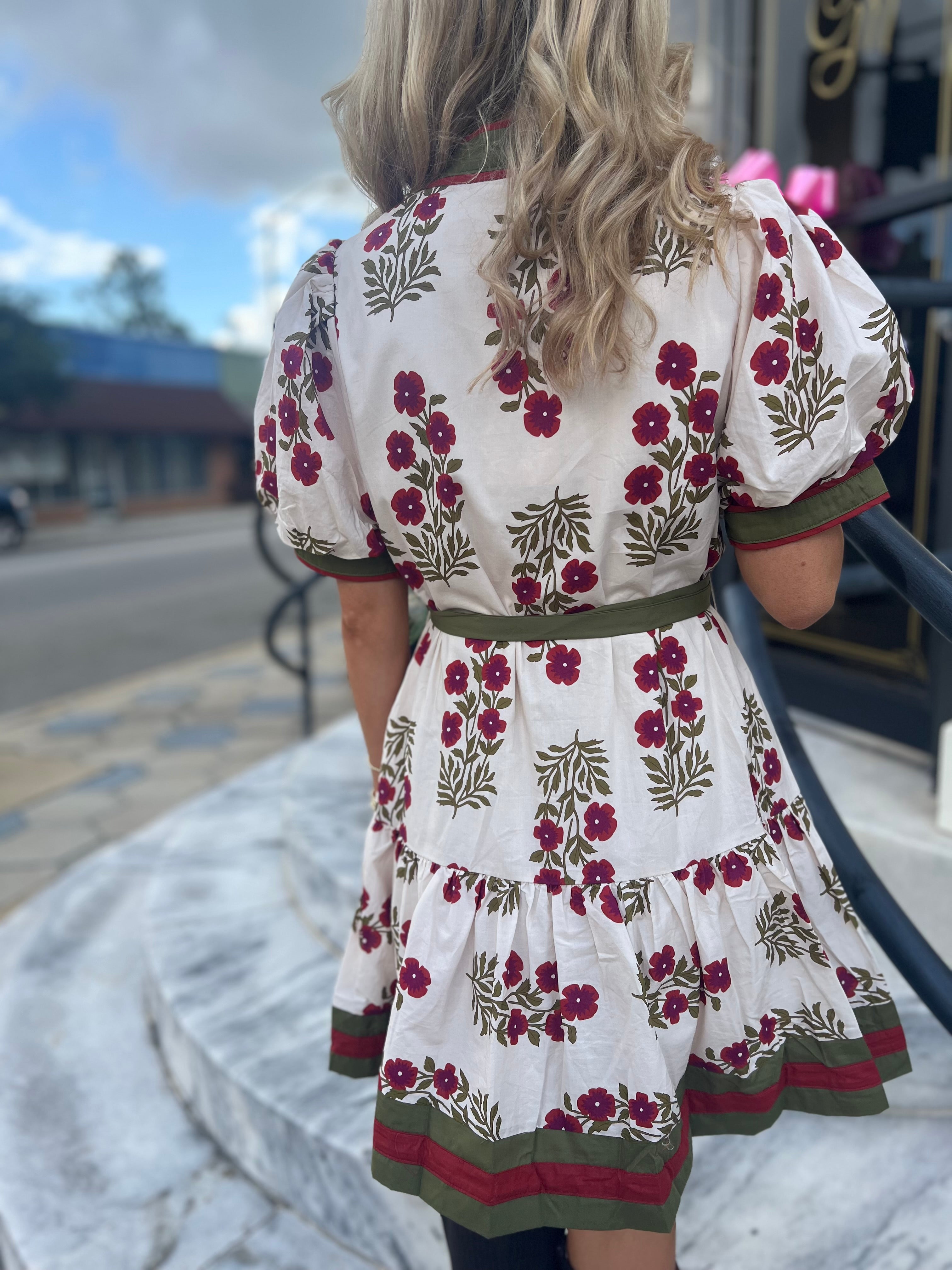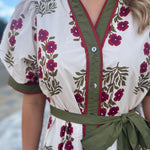 The Abby Dress in Ecru offers a charming blend of elegance and playful design. Featuring a delicate floral pattern, short puff sleeves, and a flattering ruffle hem, this lightweight mini dress is perfect for warm days and stylish outings. The V-neck with band collar and button closure adds a subtle touch of sophistication, while the removable belt lets you customize your look. Thoughtfully designed with side pockets and a non-sheer, lined woven fabric, it combines practicality with comfort for effortless all-day wear.