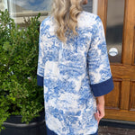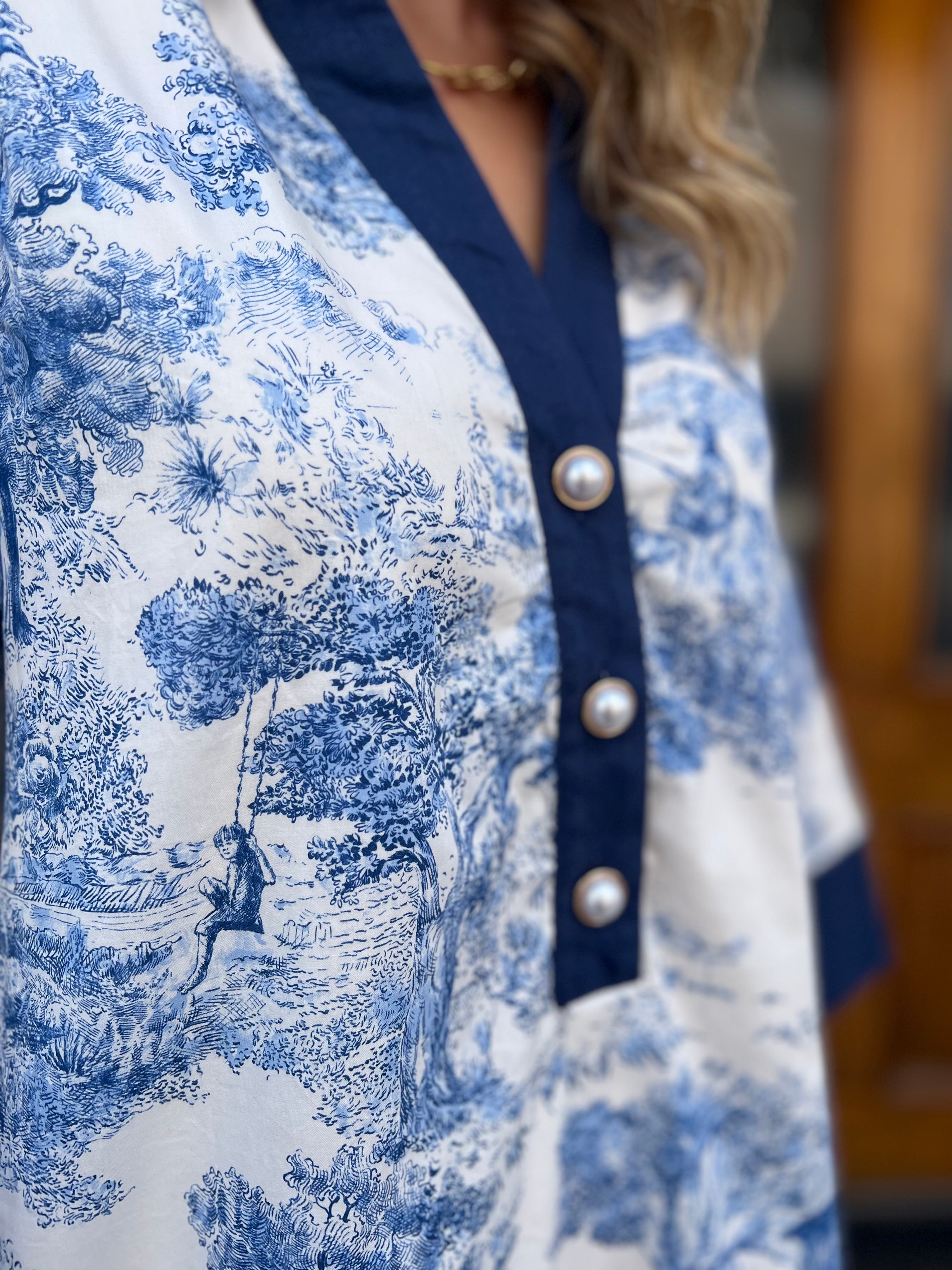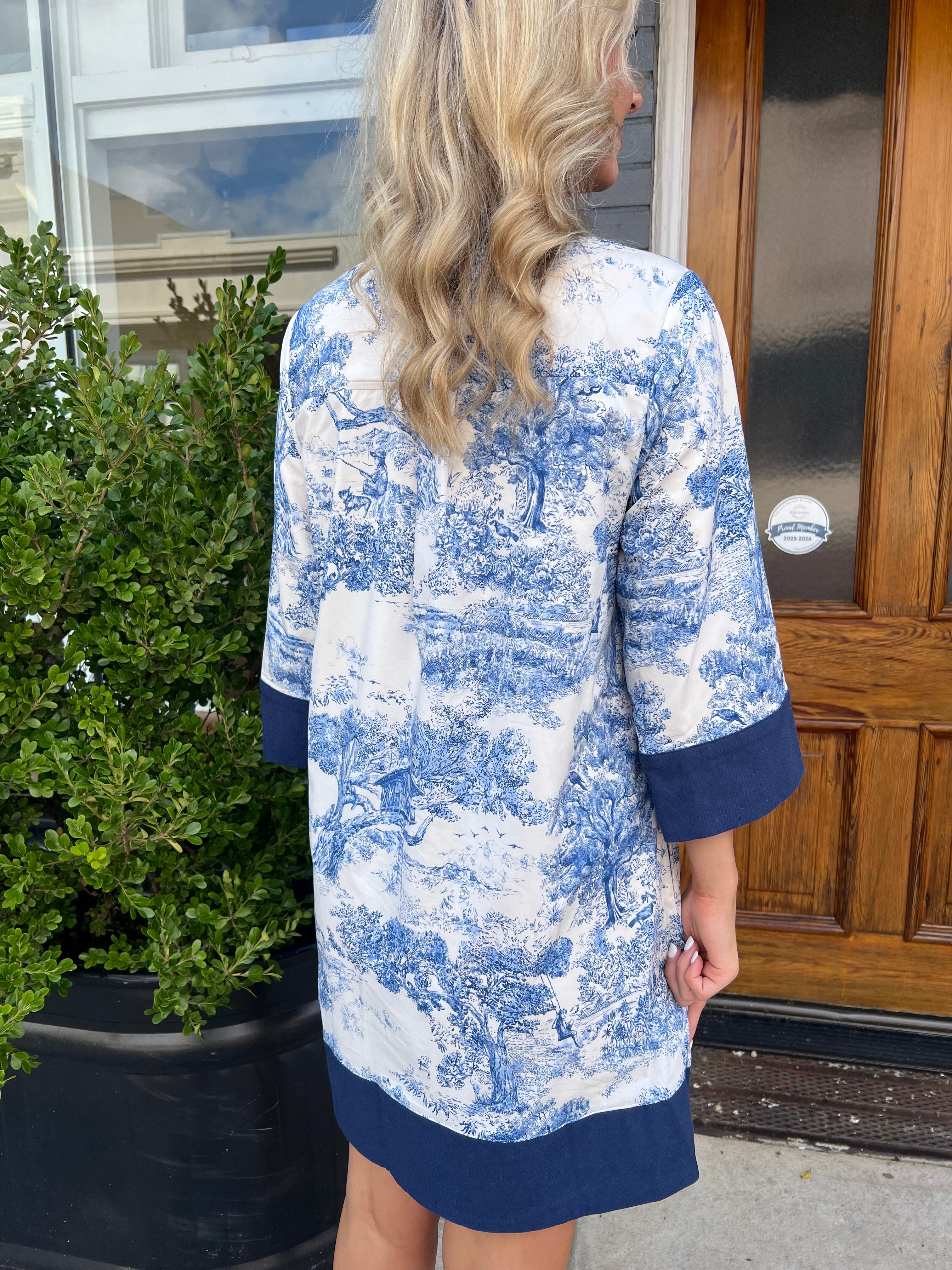 The Emma Toile Dress in Navy blends timeless elegance with modern comfort. Its delicate toile print and contrast collar with pearl buttons add refined charm, while the 3/4 sleeves and mini length keep it fresh and feminine. Lightweight and fully lined, this woven dress offers non-sheer coverage and flattering side pockets for convenience. Perfect for day-to-night wear, it’s a graceful choice that enhances both style and ease.