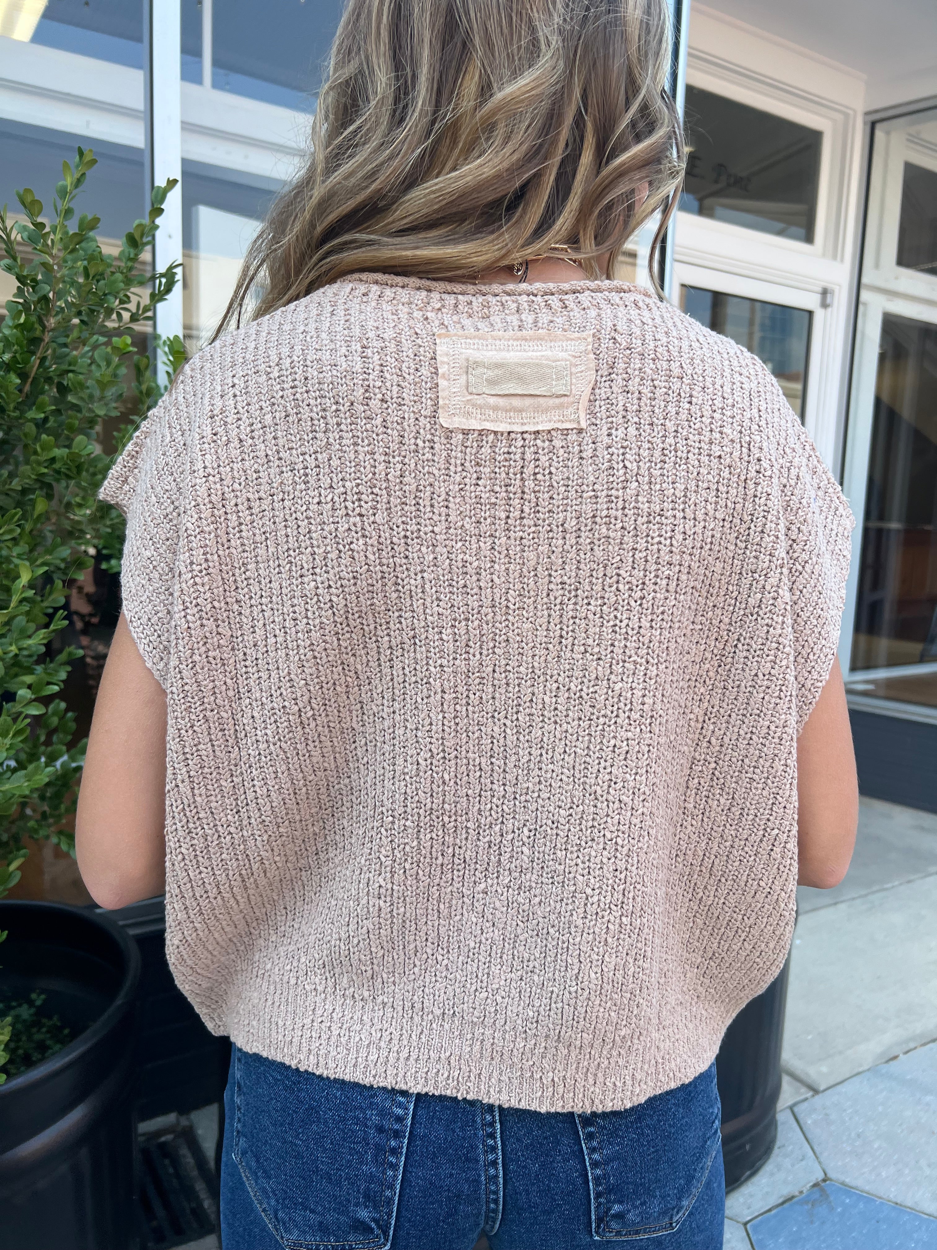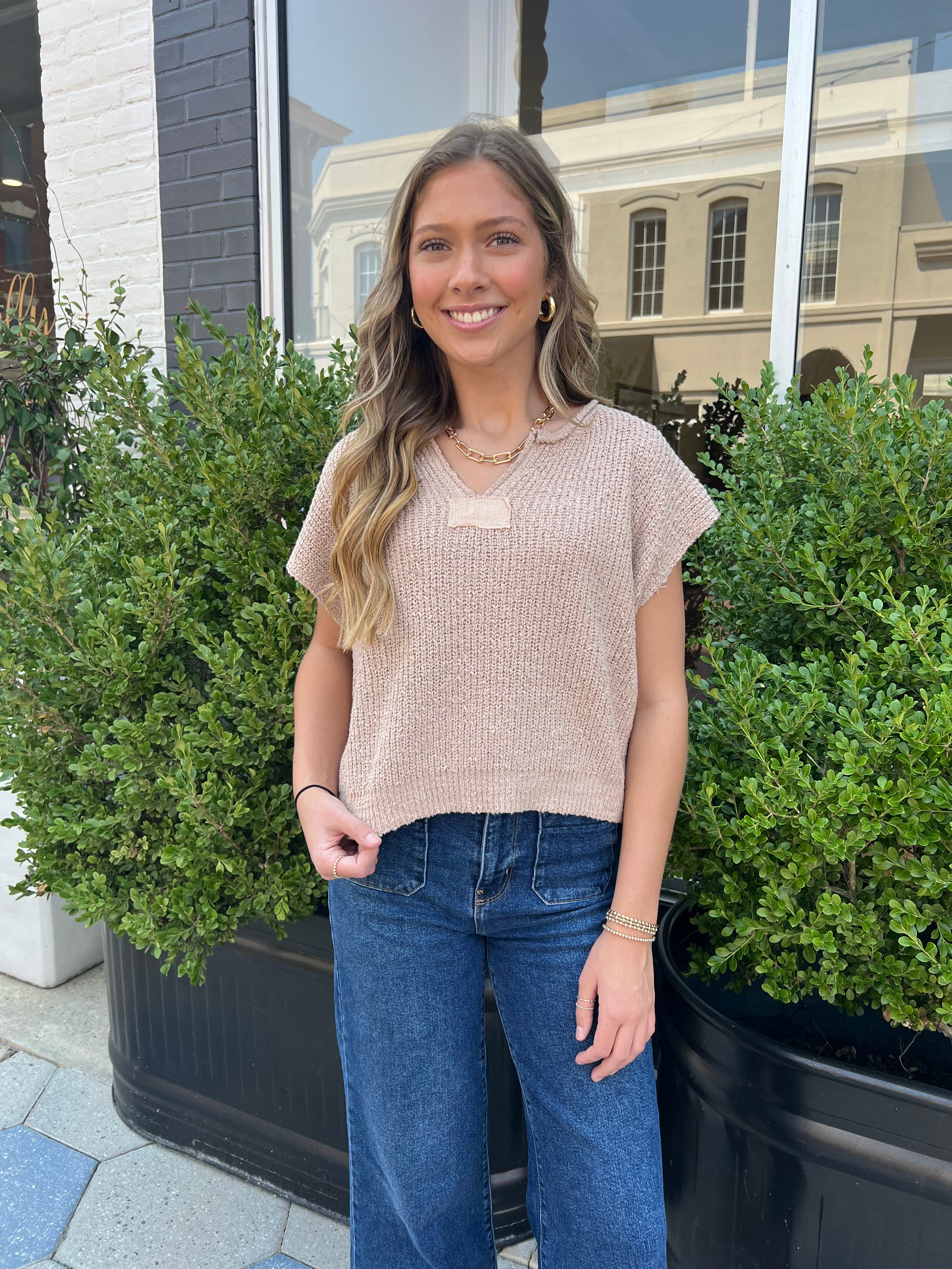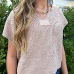 This cap sleeve sweater in oatmeal offers a perfect blend of comfort and style. Its soft gauge open knit and notched neckline create an airy, elegant look, while tonal patch details and a ribbed hem add subtle texture. Relaxed cap sleeves provide ease and a laid-back vibe, making it ideal for effortless layering or casual wear. Elevate your wardrobe with this versatile piece that combines cozy texture and refined design.