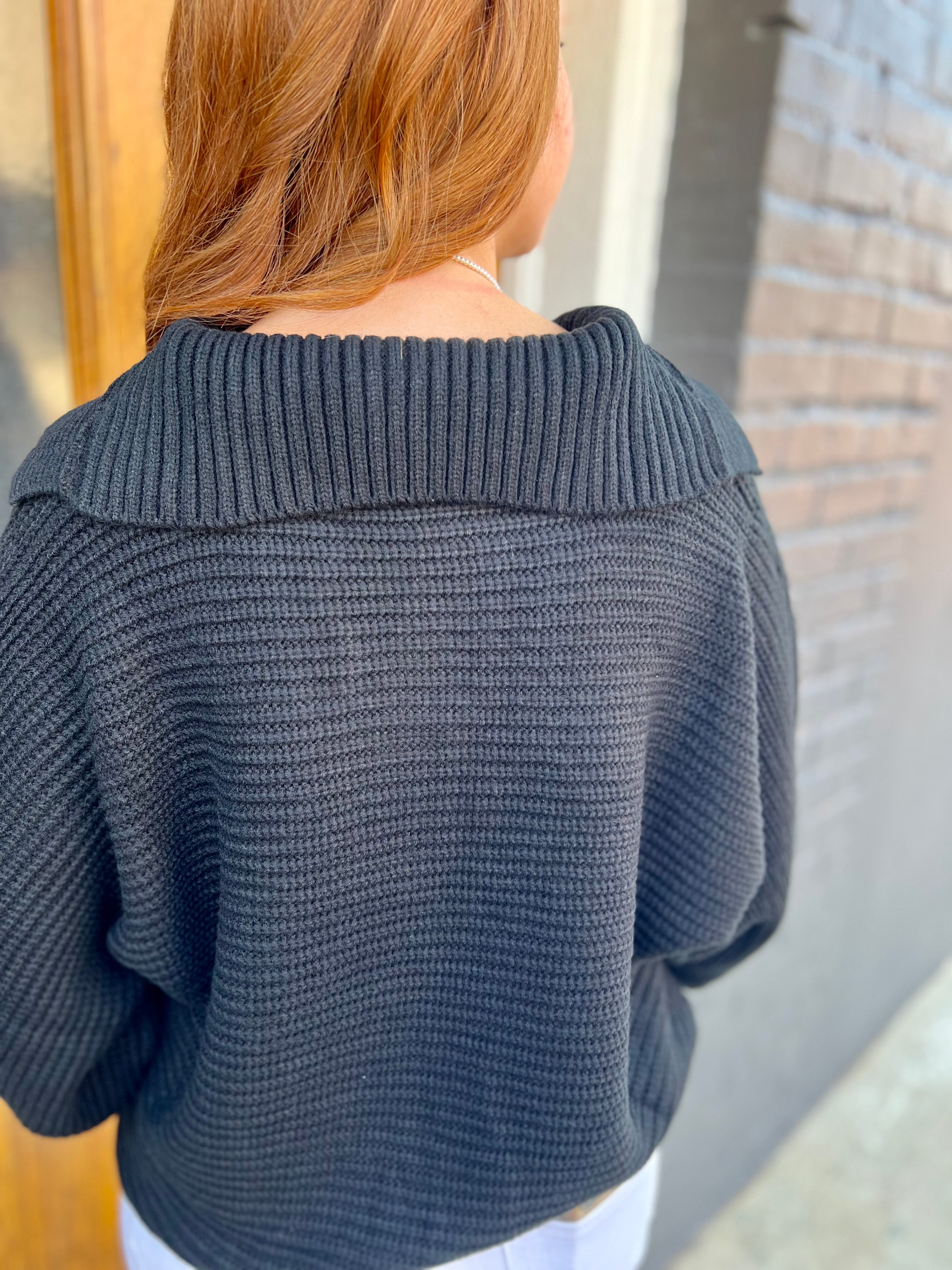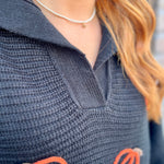 Cozy up for fall with this black collared sweater featuring long sleeves and charming small pumpkin outlines scattered across the front in vibrant orange. Its festive yet subtle design makes it the perfect seasonal piece to bring warmth and seasonal spirit to your wardrobe. Ideal for layering or wearing on its own, this sweater combines comfort with a playful autumn touch.