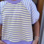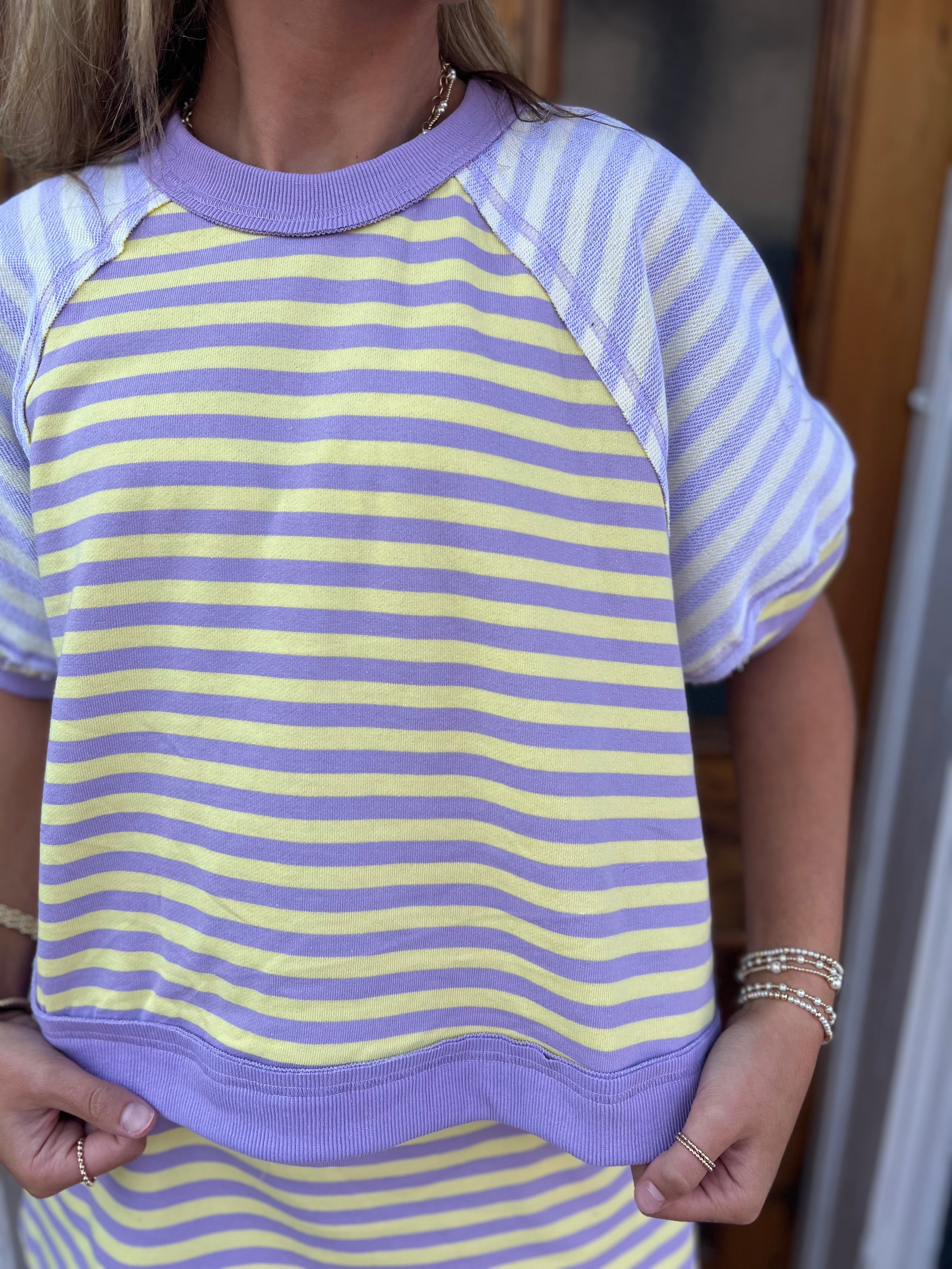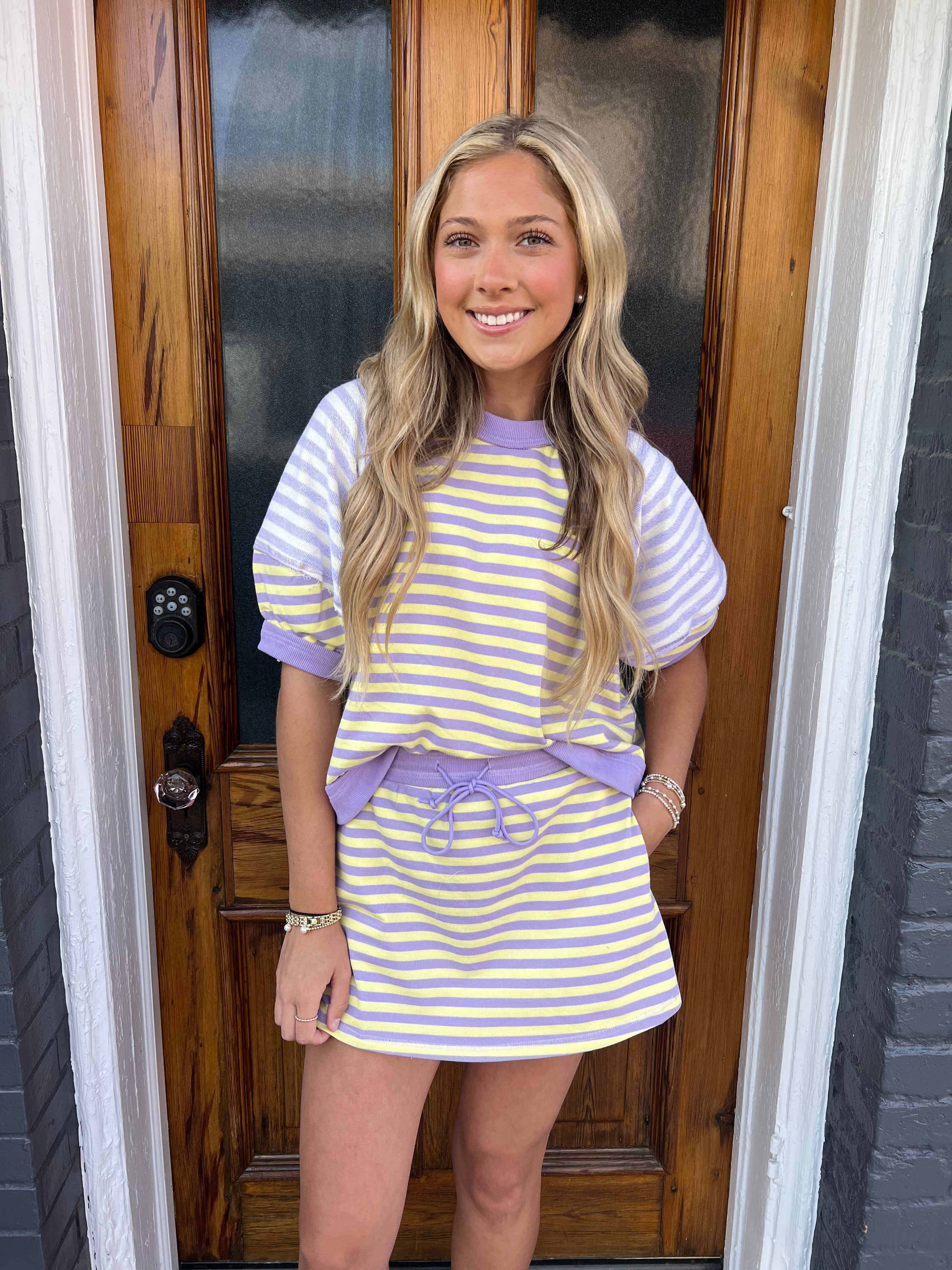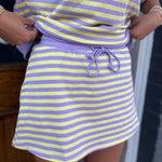 Elevate your casual wardrobe with this charming two-piece set featuring soft French terry construction. The skort showcases a playful lavender and yellow striped pattern with hidden back pleats for subtle movement and sporty appeal. Pair it with the matching crop sweatshirt, which boasts the same vibrant stripes, edgy over-seam back detailing, and a relaxed oversized fit. Perfect for those who love effortless style that blends athletic comfort with boutique-worthy charm. Mix, match, or wear together for versatile looks that feel both cozy and put-together.