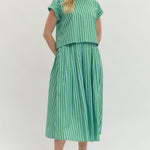 The Green Sky Set brings effortless style with coordinated separates perfect for any season. The striped midi skirt features an elasticated waistband for comfort, a sleek side zipper closure, and practical side pockets—all lined for a polished finish. Pair it with the matching striped short sleeve top, which showcases charming button details at the back and a button closure for an easy, put-together look.