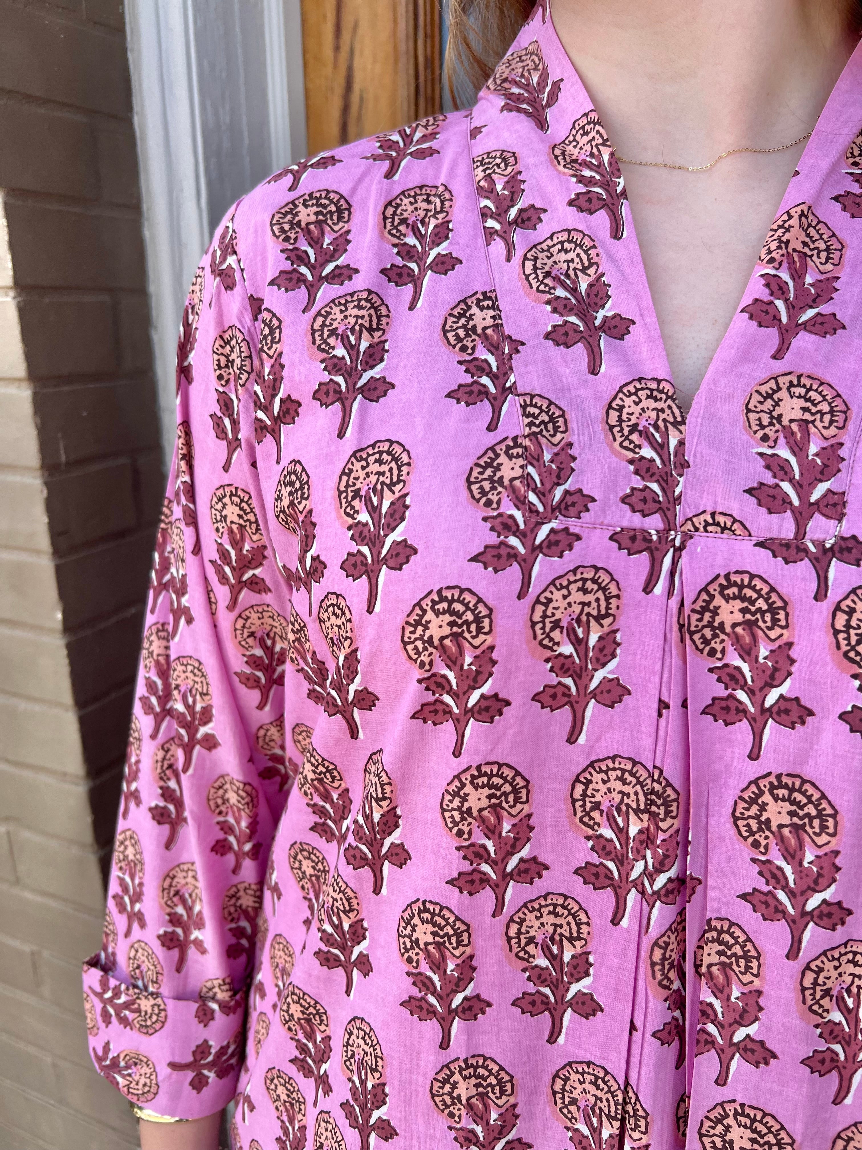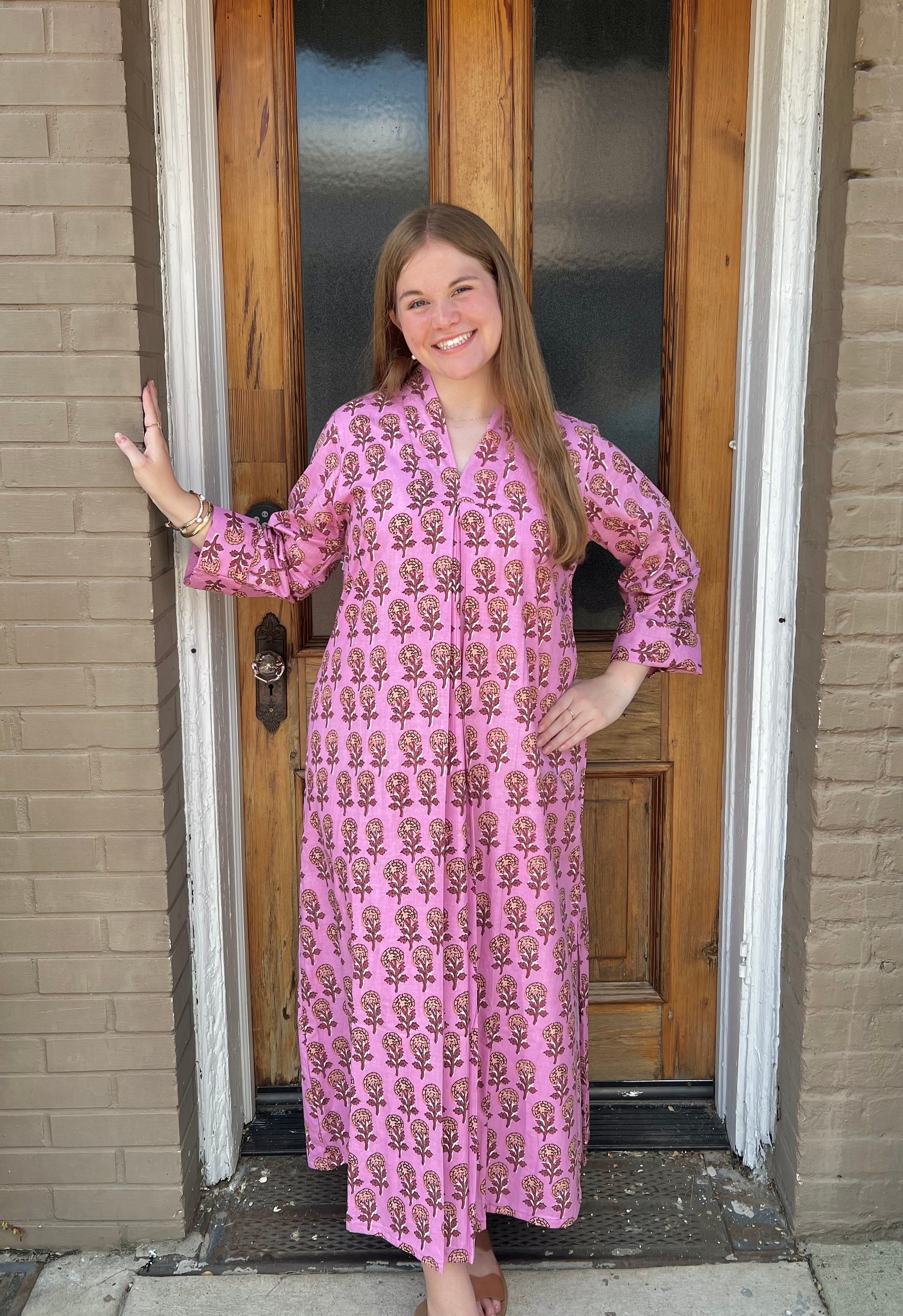 Embrace elegance with our versatile and stunning PURPLE BLOOMS CAFTAN dress! Made of 100% cotton and lined for comfort, it can be worn as a dress or a swim cover. Handcrafted in India using the traditional block printing technique, each piece is unique. Machine wash on cool for ease and durability.