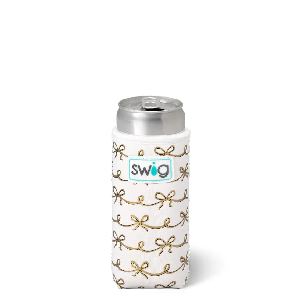 Cool drinks, dry hands! 🍺 Our insulated Coolies stop condensation and keep drinks cold for 2+ hours. Our lightweight Slim Can Coolie can be carried anywhere and stores away flat, making it the perfect event partner! Get wrapped up in these gold bows on a pale ivory background. 🎀