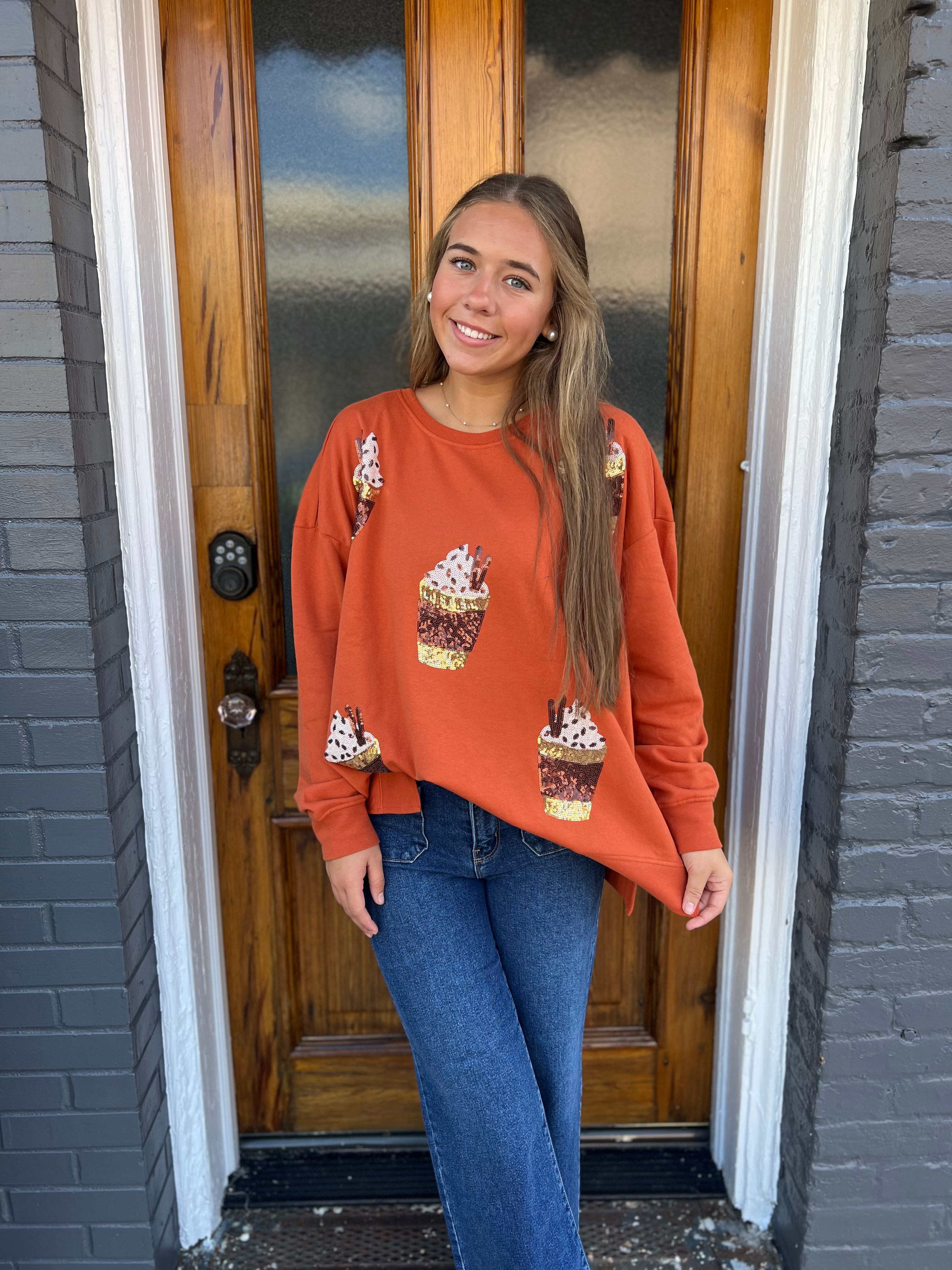 Embrace cozy autumn vibes with the Fall Sparkle Sweatshirt in Rust. Crafted from a soft cotton blend, this one-size-fits-most sweatshirt features eye-catching sequin cappuccino mug appliqués that add a playful yet chic touch. Measuring approximately 27" from shoulder to hem, it offers a comfortable fit perfect for layering. Stay warm and stylish as the season changes with this festive, sparkling essential.