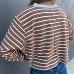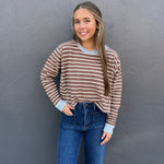 Elevate your casual look with The Renee Top in Mocha. This striped cropped long sleeve pullover combines contrast ribbed cuffs and neckline with dropped shoulders and exposed seaming for a modern edge. Crafted from a soft, textured knit, it offers relaxed comfort while maintaining a chic silhouette—perfect for effortless style every day.