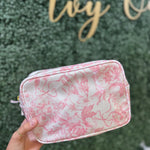 Indulge in the chic elegance of our Pink Bow Cosmetic bags. Available in both travel and rectangle sizes, these bags feature a delicate pink bow and beautiful floral design. Perfect for the preppy fashionista, these bags add a touch of sophisticated luxury to your travel essentials.