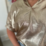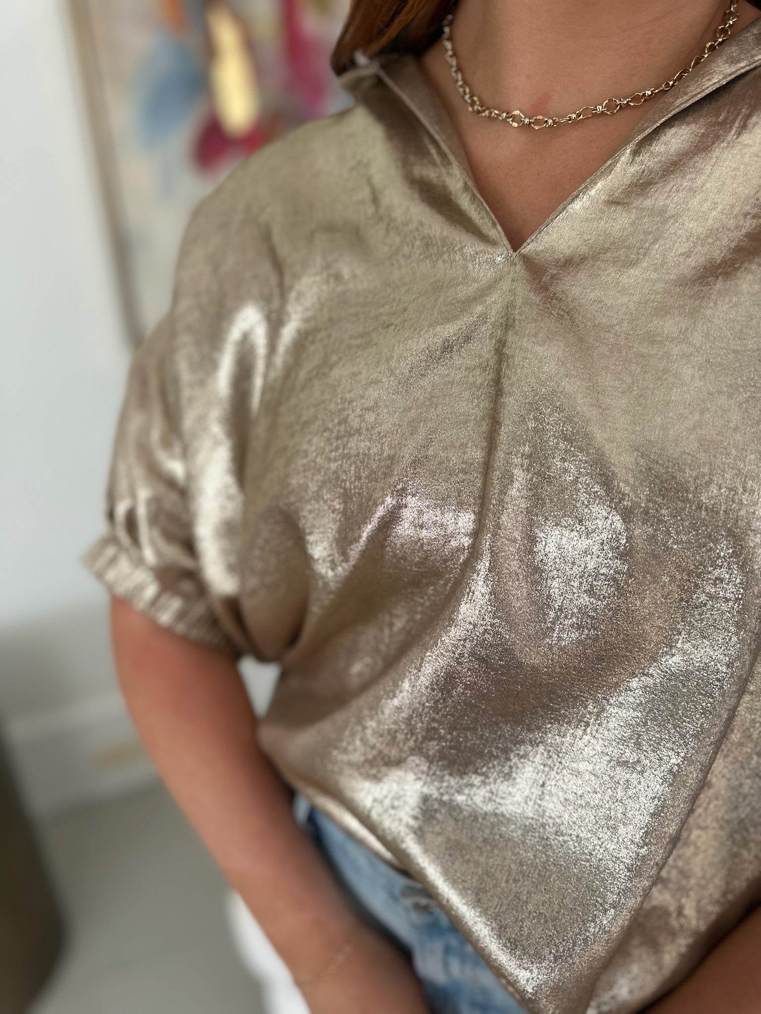 Elevate your style with this Gold Metallic Blouse featuring a sleek V-neck and a chic band collar. The short dolman sleeves offer a contemporary silhouette, while the lightweight woven fabric ensures comfort without compromising on shine. Unlined and non-sheer, it’s perfect for a standout look that feels effortless all day or night.