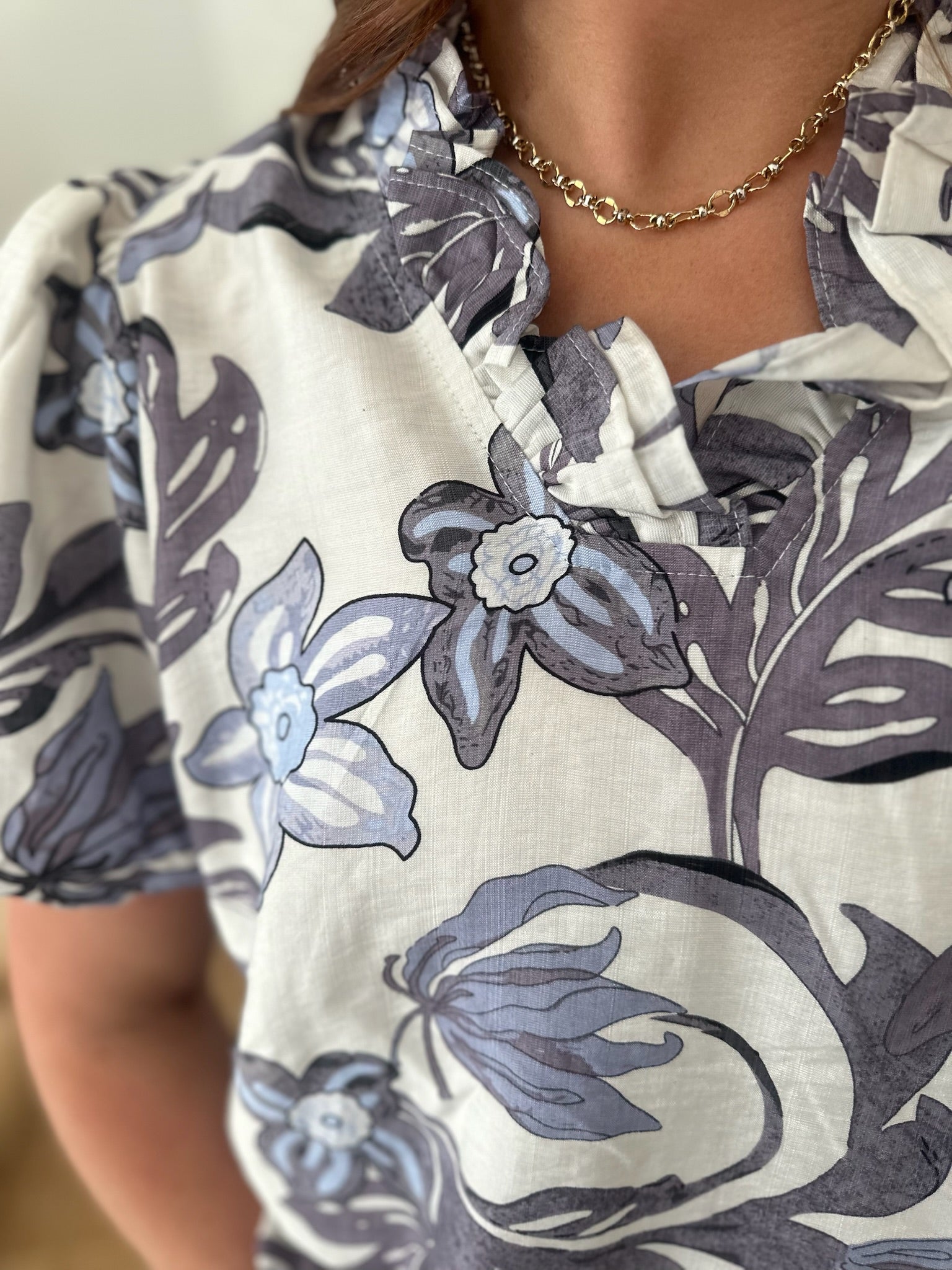 Elevate your everyday wardrobe with this stunning Lush Blossom Print Top in Grey. Featuring a captivating multi-shade floral print, this piece brings effortless elegance to any occasion. The charming split neckline adorned with delicate ruffle trim adds a touch of feminine sophistication, while short puff sleeves create a flattering silhouette. Fully lined for comfort and confidence, this versatile top pairs beautifully with your favorite jeans or skirts for a look that transitions seamlessly from day to night.