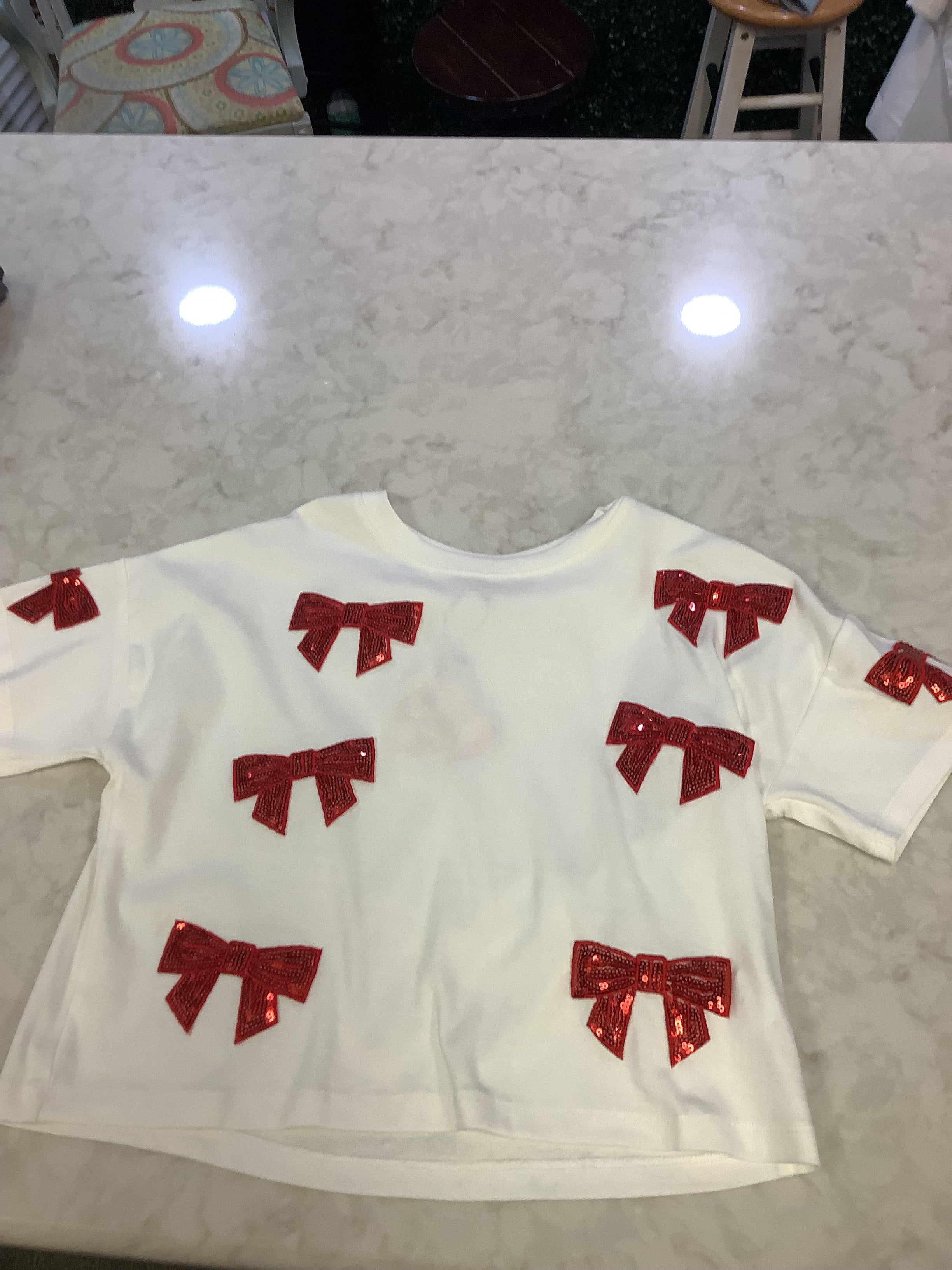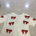This Girls Red Bow Top combines comfort and style with its soft cotton knit fabric and charming white design accented by sparkling red sequin bows. Featuring a round neckline and wide sleeves, it ensures easy movement and a flattering fit. Perfect for game days, holidays, or any special occasion, this cute top adds a festive touch to your little girl's wardrobe.