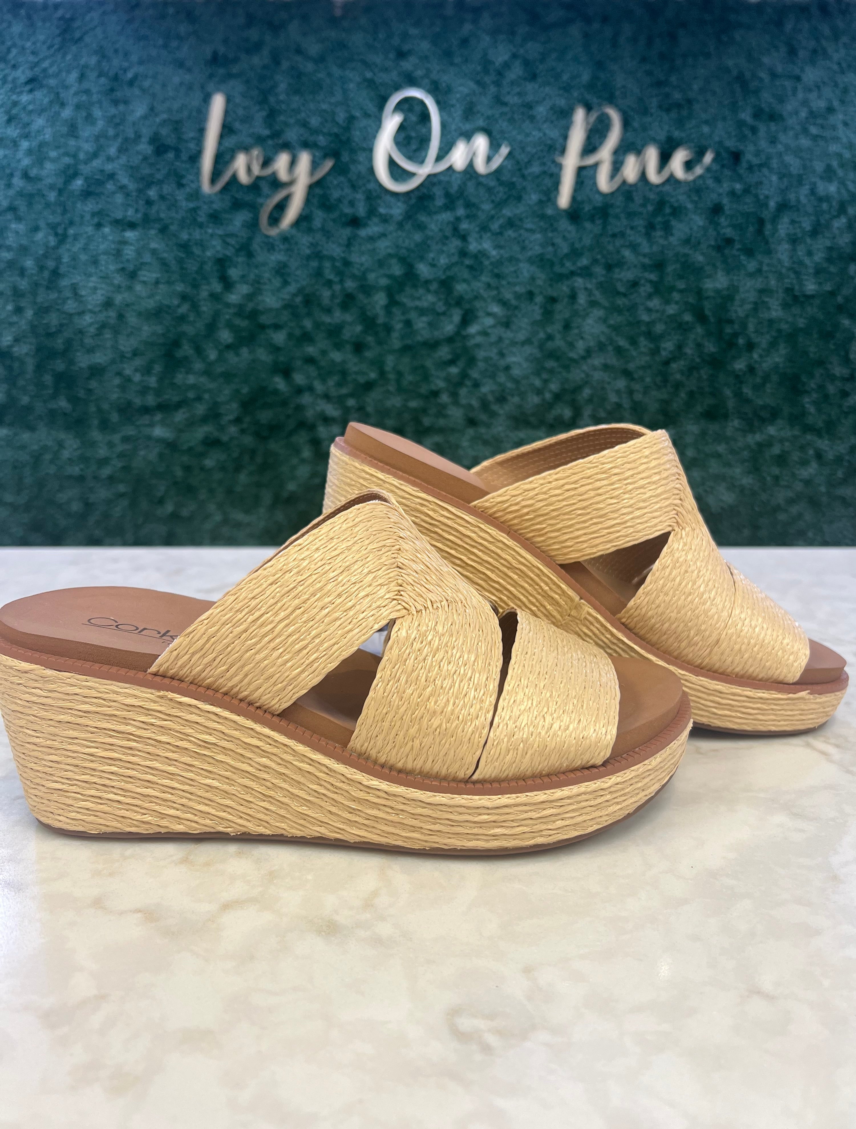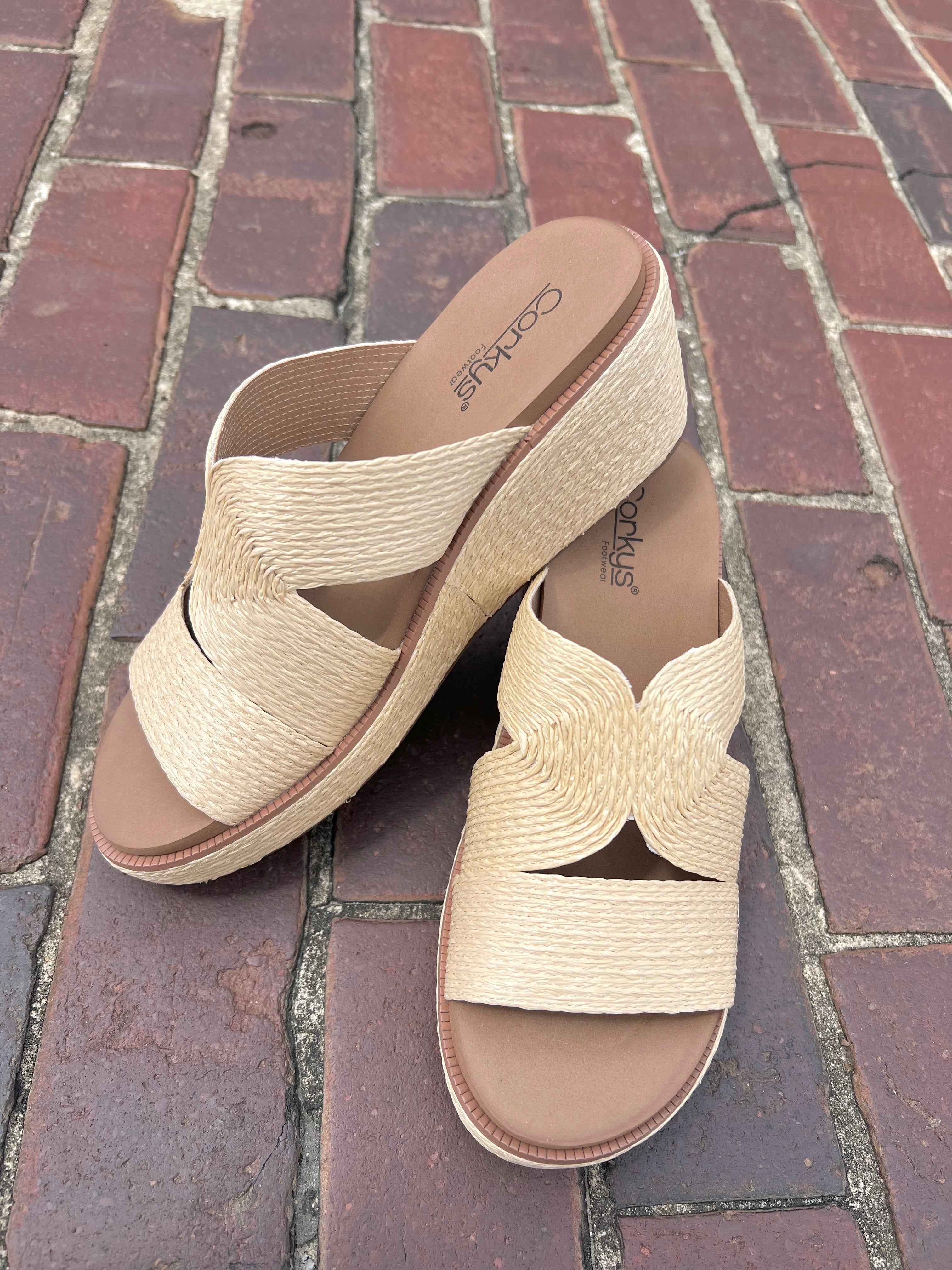 Step into effortless elegance with the Golden Hour Wedges in Natural by Corkys. These stylish 2-inch wedges offer comfortable all-day wear with easy slip-on design, perfect for sunny afternoons or evening events. Available in sizes 7 to 11, they fit true to size—choose the next size up if you're in between. Elevate your wardrobe with a versatile, chic sandal that combines glamour and comfort seamlessly.
