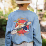Get ready for outdoor adventures with our YOUTH SUNS UP TEE. Featuring a duck in flight across the back, this long sleeve tee in heather blue will inspire your little ones to explore and embrace the thrill of duck hunting.
