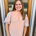 Add a touch of elegance to your wardrobe with the Katlyn Blouse. Featuring sheer floral sleeves and a frilled collar, this blush top is perfect for any occasion. The cuffed sleeves add a sophisticated touch to this elegant top.