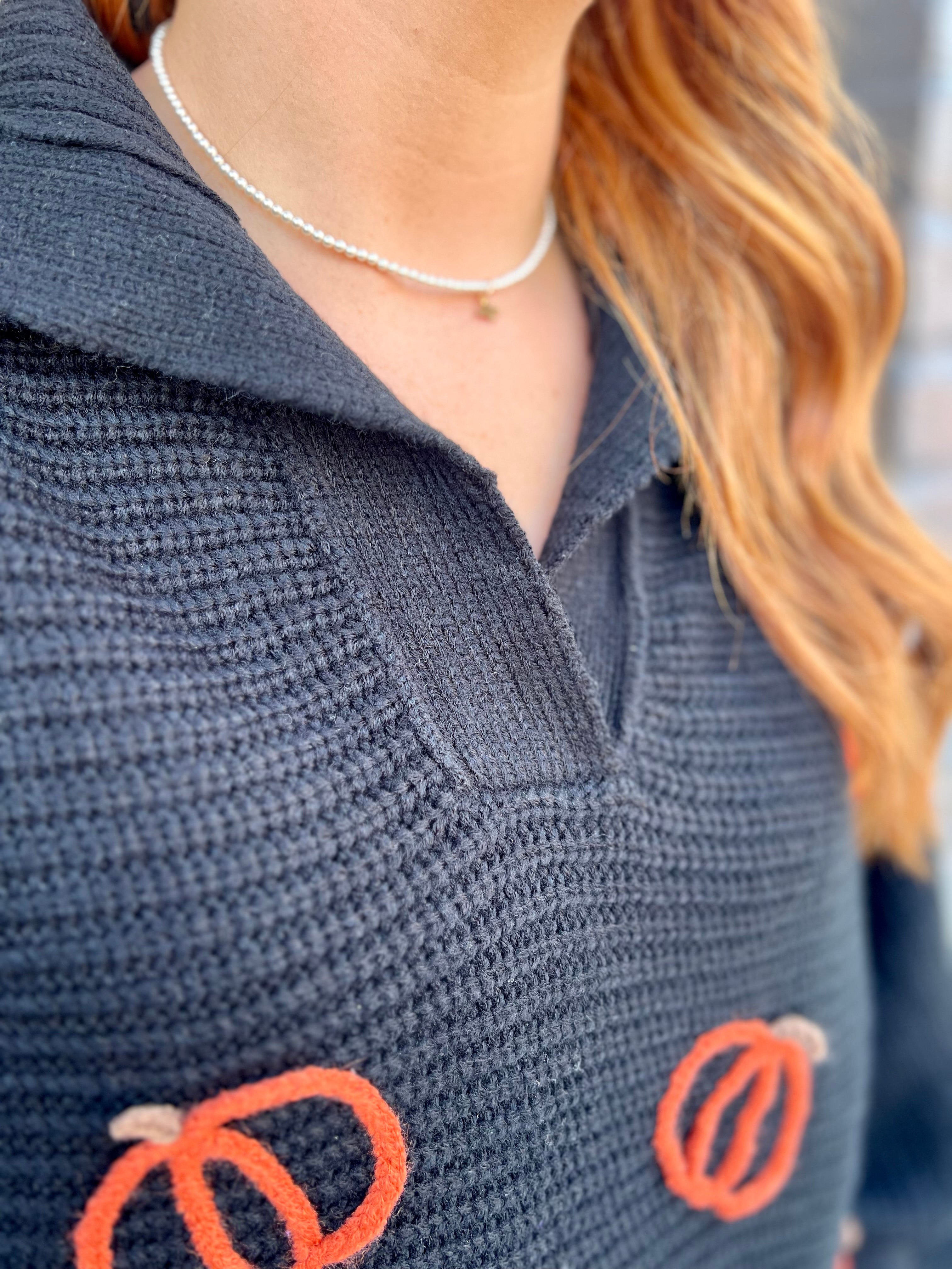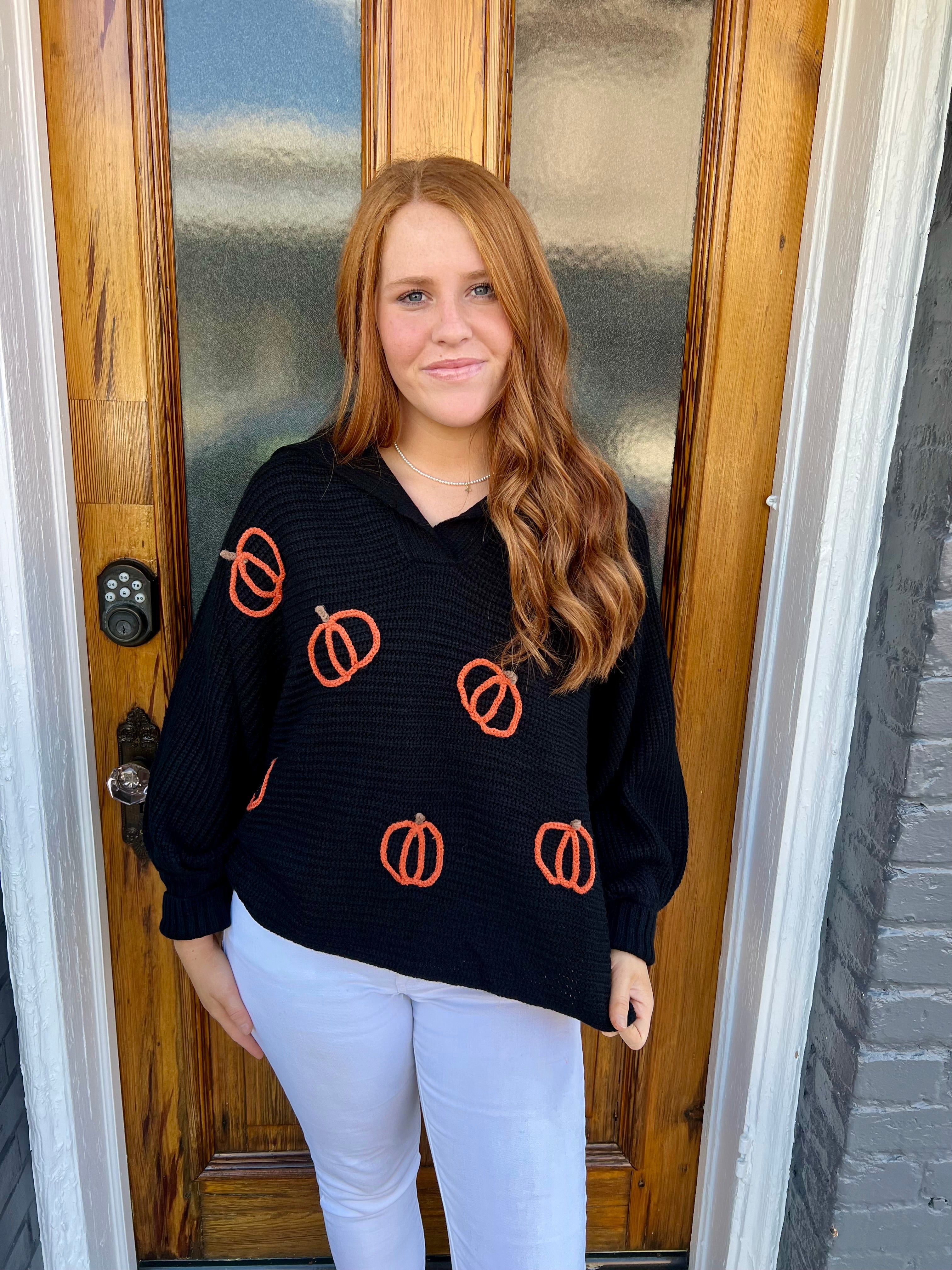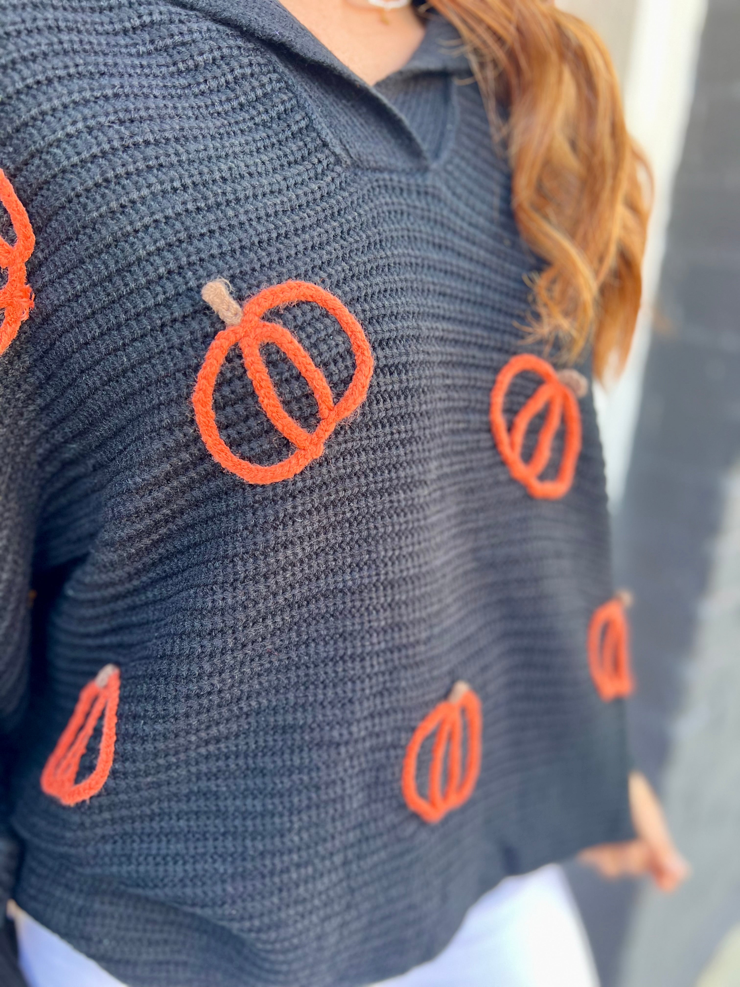Cozy up for fall with this black collared sweater featuring long sleeves and charming small pumpkin outlines scattered across the front in vibrant orange. Its festive yet subtle design makes it the perfect seasonal piece to bring warmth and seasonal spirit to your wardrobe. Ideal for layering or wearing on its own, this sweater combines comfort with a playful autumn touch.