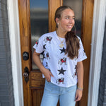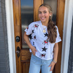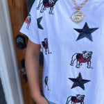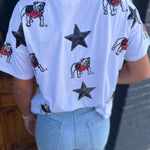Make a bold statement on game day with the All Over Sequin Boxy Tee in white. Featuring a striking black star sequin "Bulldog" design, this short-sleeve tee combines spirited style with comfortable fit. Perfect for showing your UGA pride and cheering on the Georgia Dawgs in standout fashion.