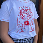 Show your team spirit in style with this white boxy tee featuring a bold red embroidered Georgia Bulldog on the front. The red swiggle detailing along the edges adds a playful touch, making it perfect for game day or casual wear. Comfortable and eye-catching, this tee is a must-have for any Georgia fan looking to stand out.