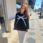 Introducing The Jenna Sweater - the ultimate combination of comfort and style. Made with a trendy ribbon print and designed with a U-neck, cuffed long sleeves, and a vented hemline, this black sweatshirt top is the perfect addition to any fashion-forward wardrobe. Feel confident and chic in The Jenna Sweater.