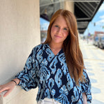 Master the art of effortless style with the WARREN TOP by MUDPIE! Made from textured polyester, this top boasts balloon long sleeves and a V-neck, elevated by a charming ruffle collar. The bold navy ikat block print adds a touch of sophistication to any look. Perfect for any occasion, this top is a must-have in any fashion-forward wardrobe.