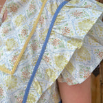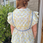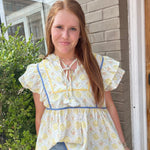 Elevate your wardrobe with our AMERICAN HONEY BLOUSE. The abstract and floral design, with muted spring colors, adds a touch of elegance to any outfit. The double ruffle shoulder and tie V neck create a feminine silhouette, while the square trim detail on top adds a unique touch. Feel confident and stylish in this must-have blouse.