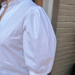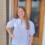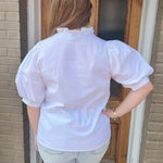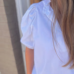 The BERNADETTE BLOUSE is the perfect white blouse for any occasion. With a ruffle collar and bubble sleeves, it adds a touch of elegance and femininity. The band top provides a flattering fit, making you look and feel your best. Elevate your wardrobe with this must-have piece!