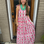 Turn heads in our BOW MAXI DRESS! Embodying southern charm, the statement bow on the shoulder straps is inspired by the vivid colors of Santorini. Handcrafted in India using block printing techniques, each dress is one-of-a-kind. Made with 100% cotton and lined for comfort. Machine washable for easy care.