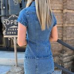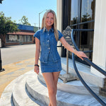 This button front denim top features a classic collar and three buttons down the front for a timeless look. Its short sleeves make it perfect for warm days, while the versatile denim fabric pairs effortlessly with our denim mini skirt or your favorite shorts, creating a stylish and comfortable outfit for any casual occasion.