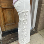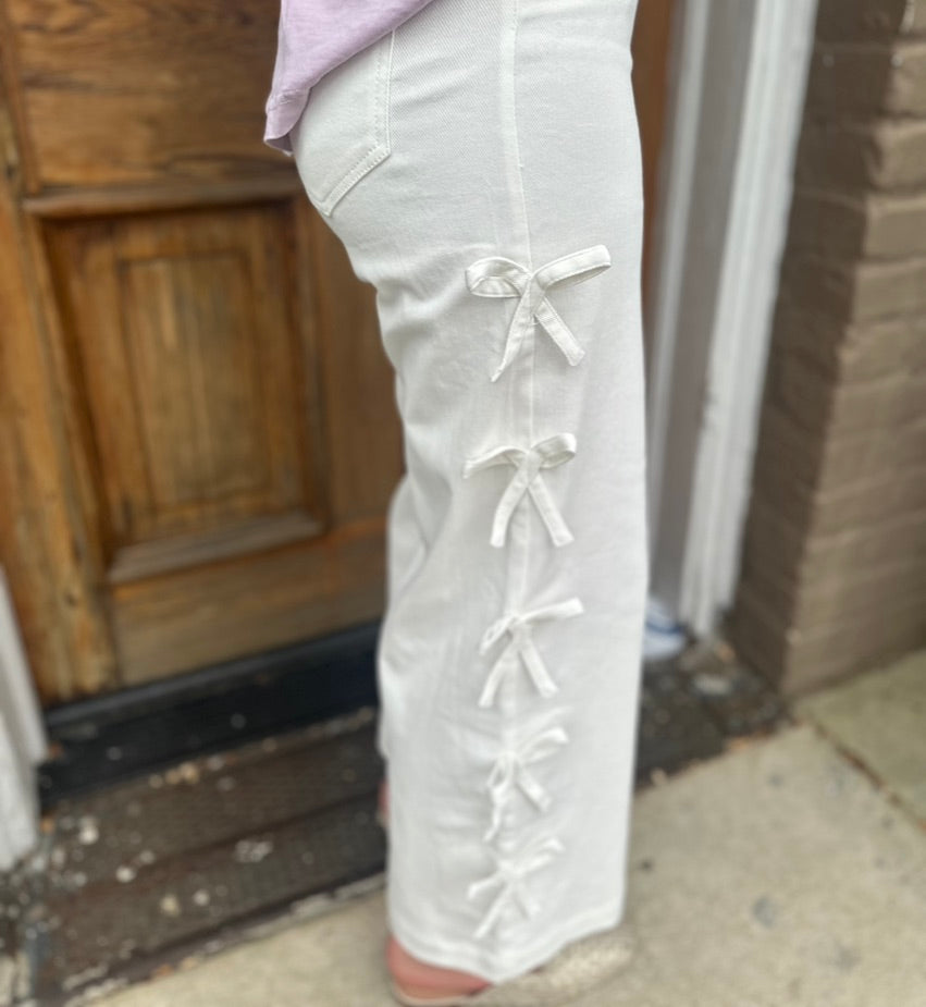 Elevate your denim game with these white cropped pants featuring charming fixed bow details at the sides. Classic pockets and a button and zipper closure make for a versatile and stylish addition to any wardrobe. The midweight, non-sheer fabric offers comfort and durability.