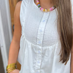 This cropped white button-down top combines classic style with a modern twist. Featuring delicate pleated detailing on the chest and a flowy hem, it offers a flattering fit that moves with you. Perfectly versatile, it pairs effortlessly with shorts, skirts, or jeans to elevate your casual wardrobe with ease.