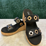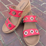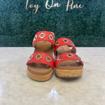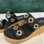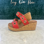 Elevate your style with the Hi Tide double-strap wedge sandal from Corkys! Made for comfort and sophistication, this sandal features elegant details like gold floral-shaped rivets and textured black leather. Effortlessly elevate any outfit, from flowy dresses to casual shorts. The lightweight cork wedge and platform provide all-day comfort. Step out with confidence and style!