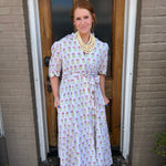 Elevate your wardrobe with the ISABELLA GRACE SCALLOPED DRESS! This stunning dress features delicate scalloped details on the sleeves and waist tie. Handcrafted in India using block printing, each dress is unique with slight variations in ink colors. Made with 100% cotton and lined for comfort. Keep it looking beautiful with easy machine washing and air drying.
