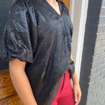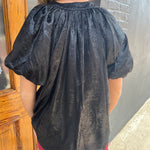 Elevate your style with this striking black metallic blouse featuring a flattering V-notch neckline with delicate pleated detail. The shimmering fabric catches the light beautifully, while the puff sleeves add a touch of drama and sophistication. Lightweight and unlined, it offers comfortable wear for day or night occasions. Perfect for making a bold, elegant statement wherever you go.