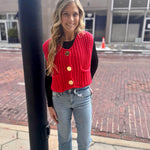 Experience the perfect blend of style and comfort with our Molli Knit Vest. The vibrant red color and trendy gold buttons add a touch of sophistication, while the soft knit fabric keeps you feeling cute and comfy all day long. Elevate your wardrobe with this must-have piece!