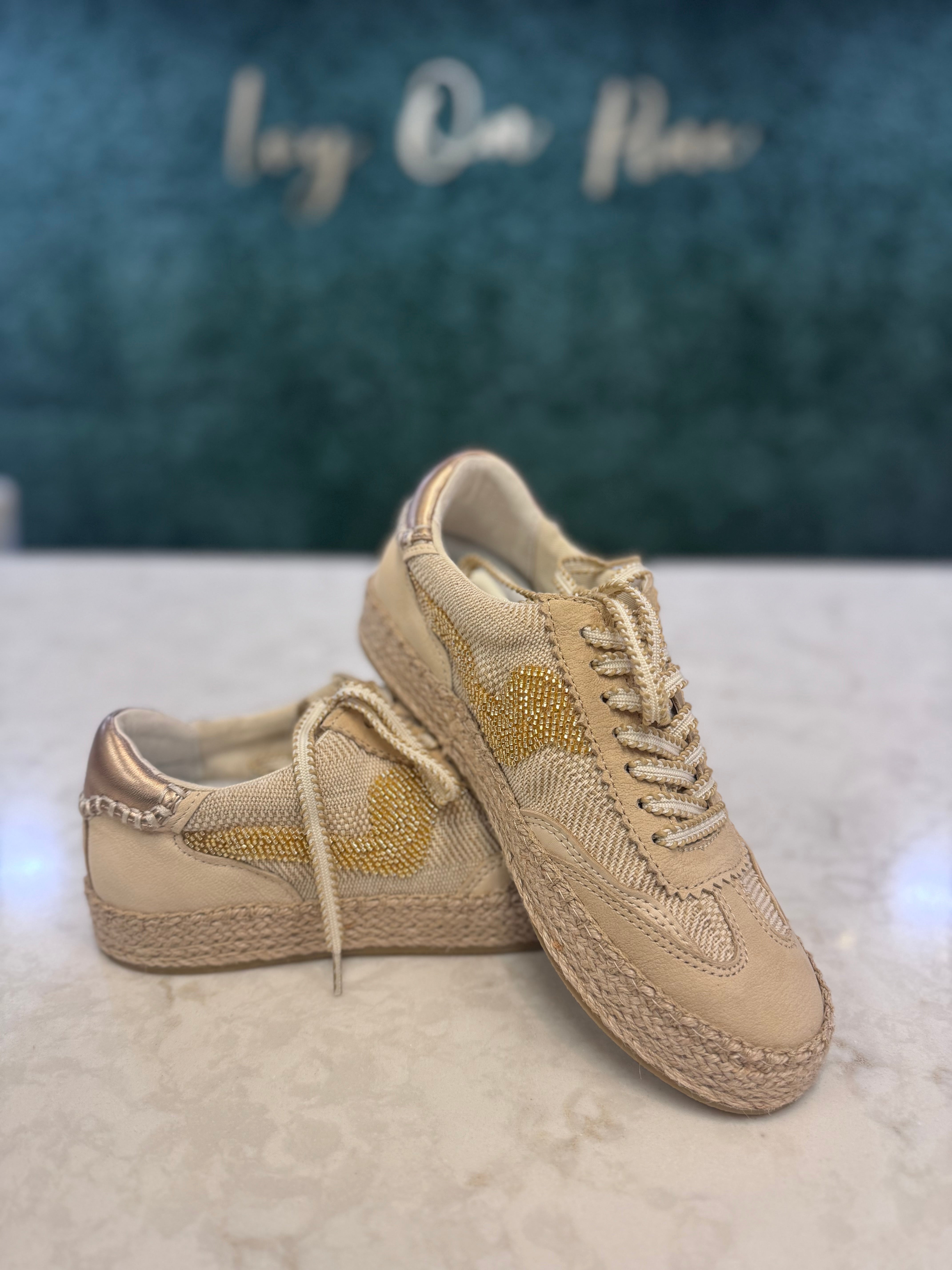 The NOTICE ESPADRILLE BURLAP SNEAKER BY DOLCE VITA is an eco-friendly, stylish option for all-day wear. Made from burlap and recycled materials, it features a unique espadrille-inspired sole and intricate beaded details. Comes with two pairs of laces for versatile styling options. Perfect for pairing with a boho-chic outfit for a touch of earthy texture.