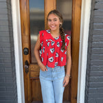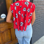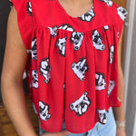 The Paige Short Sleeve Top in vibrant red features a playful all-over print of GA Bulldog heads, making it a spirited choice for game day. Its shirred design adds a flattering, comfortable fit that pairs perfectly with our Bailee Shorts or any skirt for a stylish, spirited look. Show your team pride with effortless style and comfort.