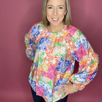 Elevate your style with our Perfectly Paisley Top! Featuring a dramatic paisley patchwork print, ruffle balloon sleeves, and a vibrant color combo of blues, oranges, and fuchsia. Make a statement and add a touch of bohemian charm to any outfit.