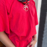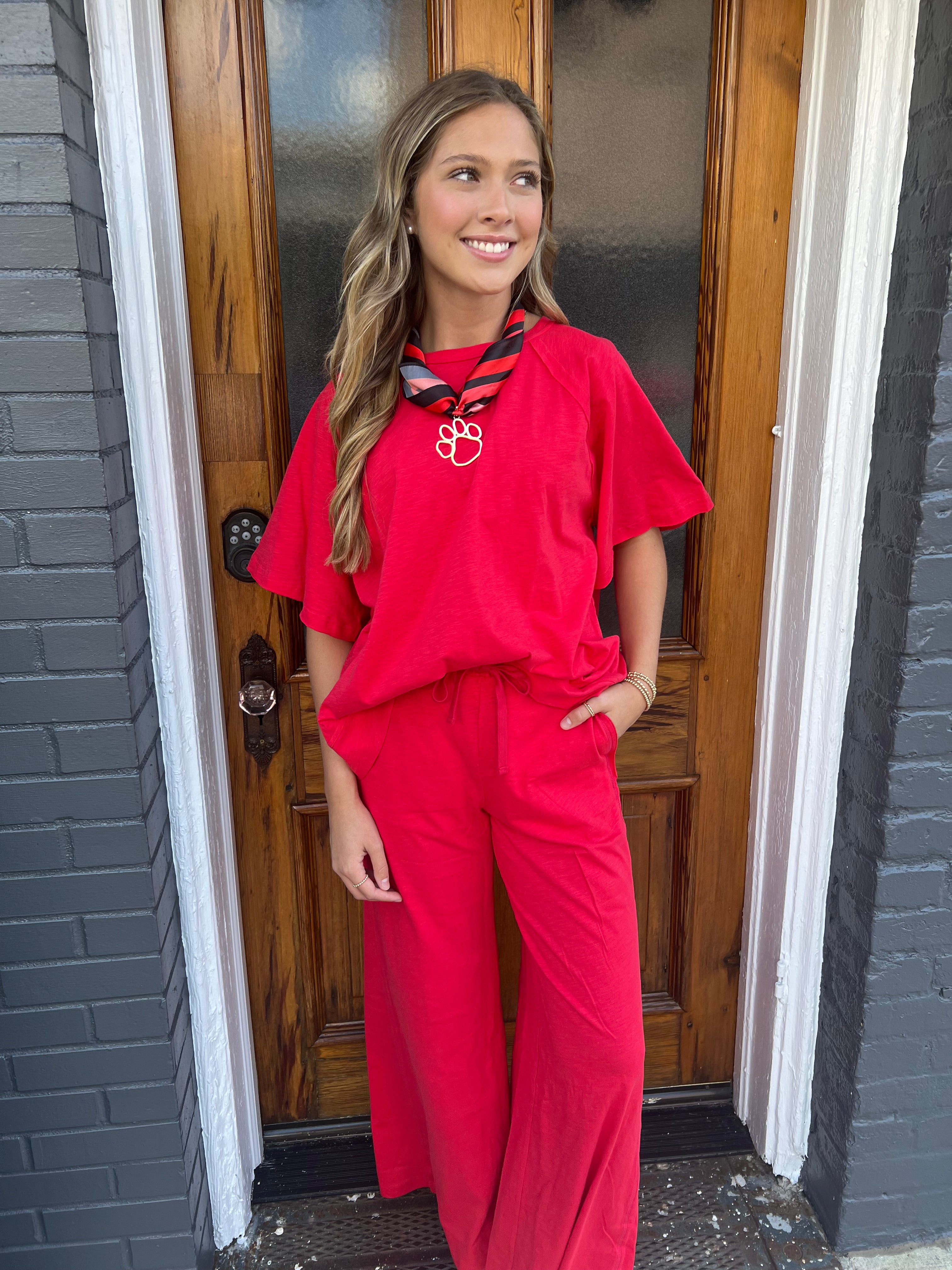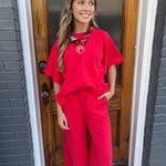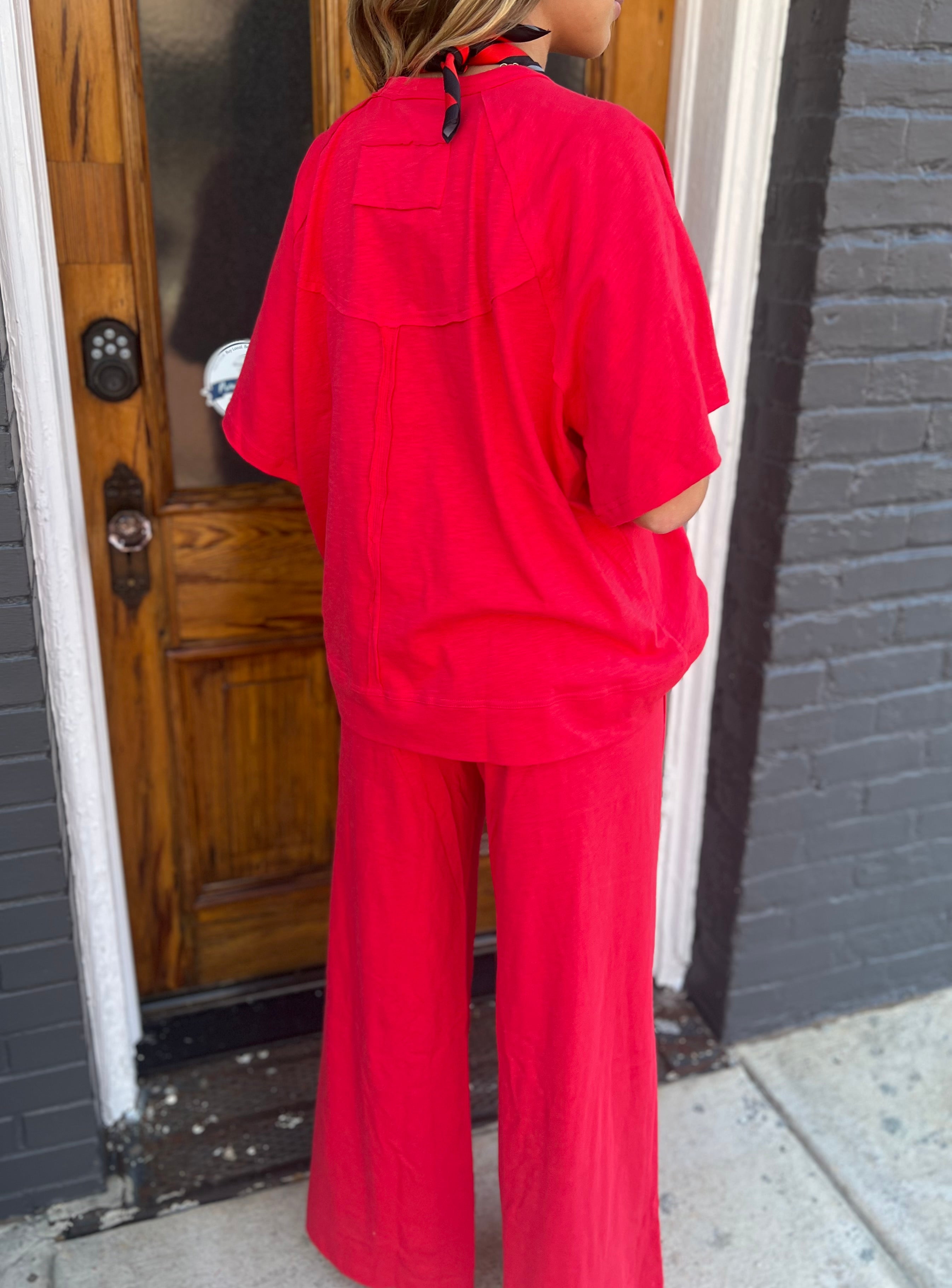 Experience ultimate comfort and style with the Red Slub Pant Set. Crafted from breathable, lightweight cotton slub fabric, this set features a relaxed, high-rise wide-leg pant with an adjustable elastic waistband and raw edge details for a modern touch. The oversized short-sleeve top complements the pants perfectly, offering a round neck and unique raw edge back design. Ideal for lounging or casual wear, this set combines effortless style with all-day comfort.