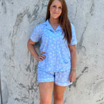 This Ribbon PJ Set combines luxury and comfort with a delicate design of blue and white bows. The button-down front adds a touch of sophistication, perfect for lounging or sleeping. Experience elegance in your downtime with our exclusive PJ set.
