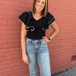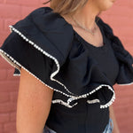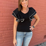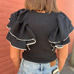 Elevate your wardrobe with this black ruffle sleeve top, crafted from soft rib knit material for comfortable wear. The delicate lace details on the ruffled sleeves add a feminine touch, making it perfect for game day or back-to-school style. Lightweight and breathable, this top pairs effortlessly with your favorite jeans or skirts for a chic, casual look.