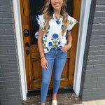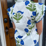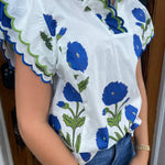 Elevate your wardrobe with the Scallop Trim Floral Blouse, featuring a delicate scalloped split neckline adorned with contrast embroidery for a refined touch. The flutter sleeves showcase multi-tone scallop edging, adding graceful movement and subtle color variation. Designed with a relaxed fit, this blouse offers effortless comfort and style in an elegant off-white mix. Perfect for both casual outings and dressier occasions, it brings a fresh, feminine charm to any look.