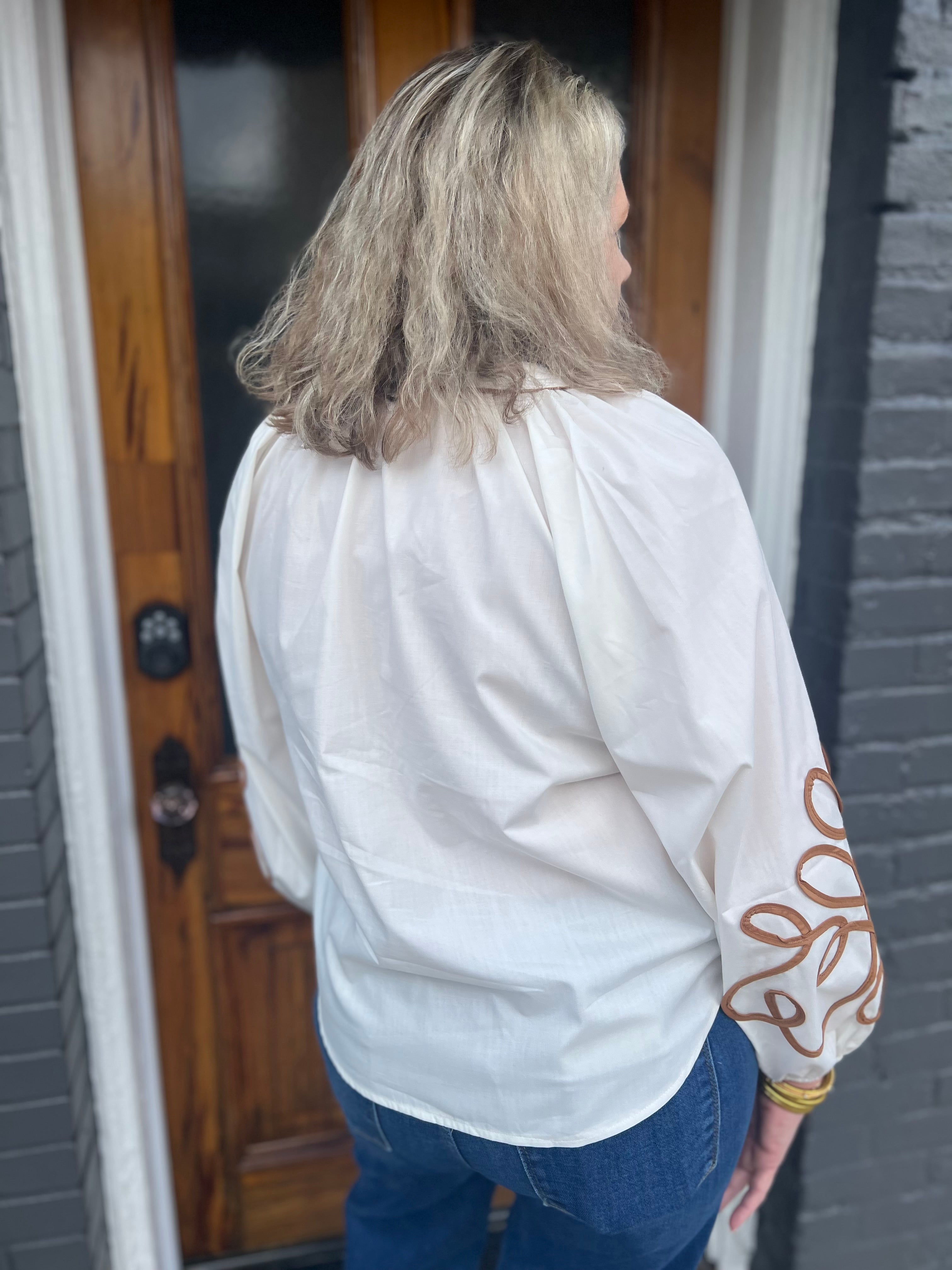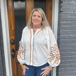 Elevate your wardrobe with the Soutache Blouse in Ivory, featuring elegant caramel details that add a refined touch. Designed with a flattering V-neck and long balloon sleeves, this button-down blouse effortlessly blends sophistication and comfort. Perfect for layering under a blazer or pairing with jeans, it’s versatile enough for both dressy occasions and casual outings. Make a statement with timeless style that adapts to your day.
