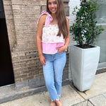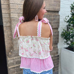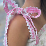 The Anna Top elevates your summer wardrobe with its thoughtfully designed double-tiered silhouette. The upper tier showcases a delicate pink floral print while the lower tier features charming pink gingham, both beautifully trimmed with white ric rac detailing. Adjustable shoulder ties ensure the perfect fit for your unique style. Versatile and eye-catching, this top pairs effortlessly with shorts or skirts for an irresistible warm-weather ensemble.