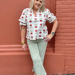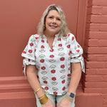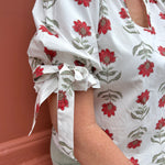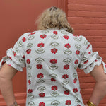 Introducing THE ANNABETH TOP! This floral print top is the perfect combination of elegance and comfort. Its split ruffle neck and bow accent add a touch of femininity, while the elasticated elbow length bubble sleeves provide a flattering fit. Unlined and lightweight, this top is perfect for any occasion.