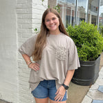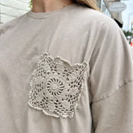Elevate your casual wardrobe with THE BOHO EASEL TOP, a statement piece designed for effortless style. This mineral-washed top features wide short sleeves with dropped shoulders and a flattering crew neckline. The distinctive crochet chest pocket adds artisanal charm, while side slits ensure comfortable movement. Its boxy, oversized silhouette creates a relaxed fit that's perfect for those who appreciate laid-back luxury.