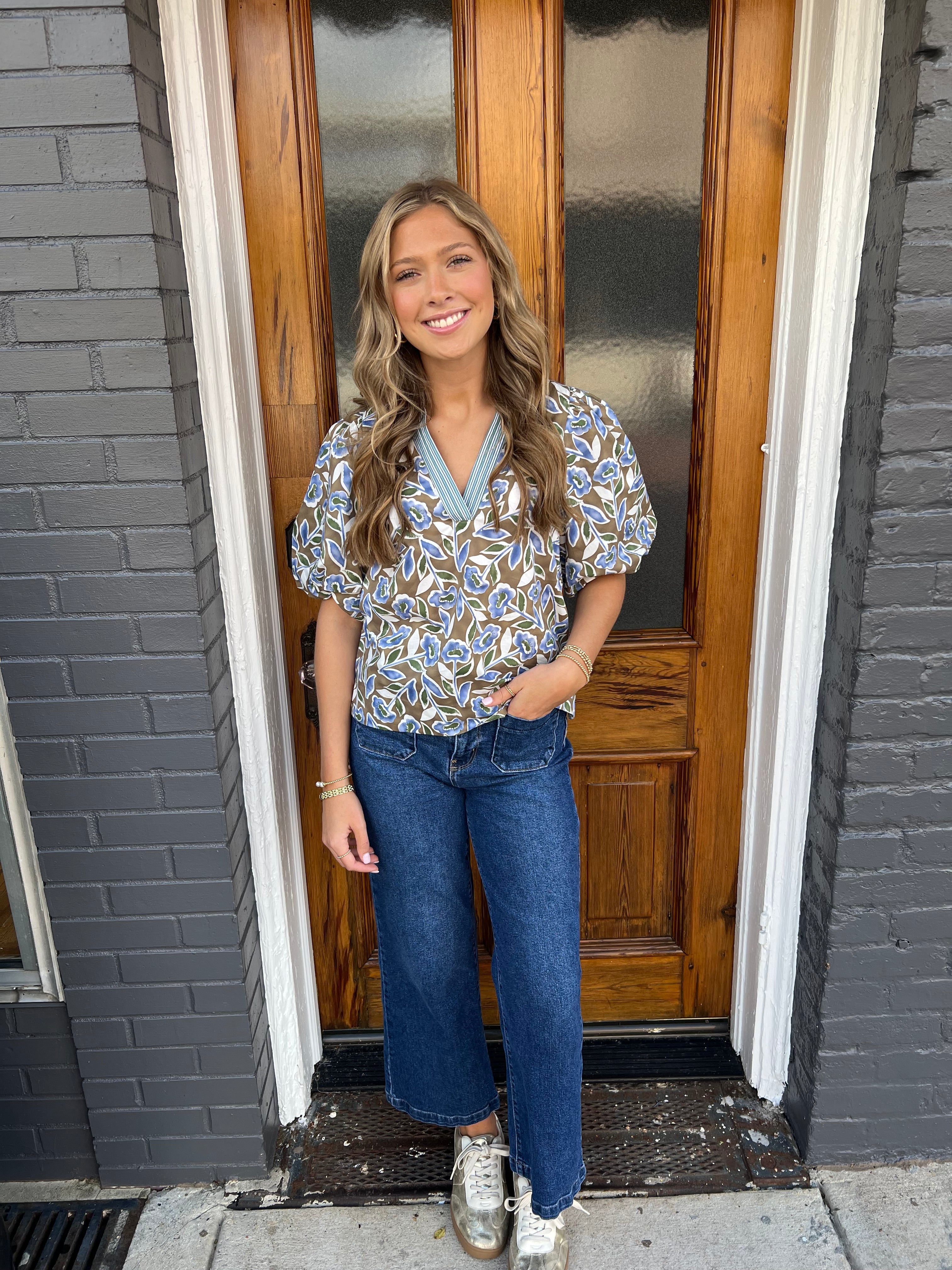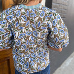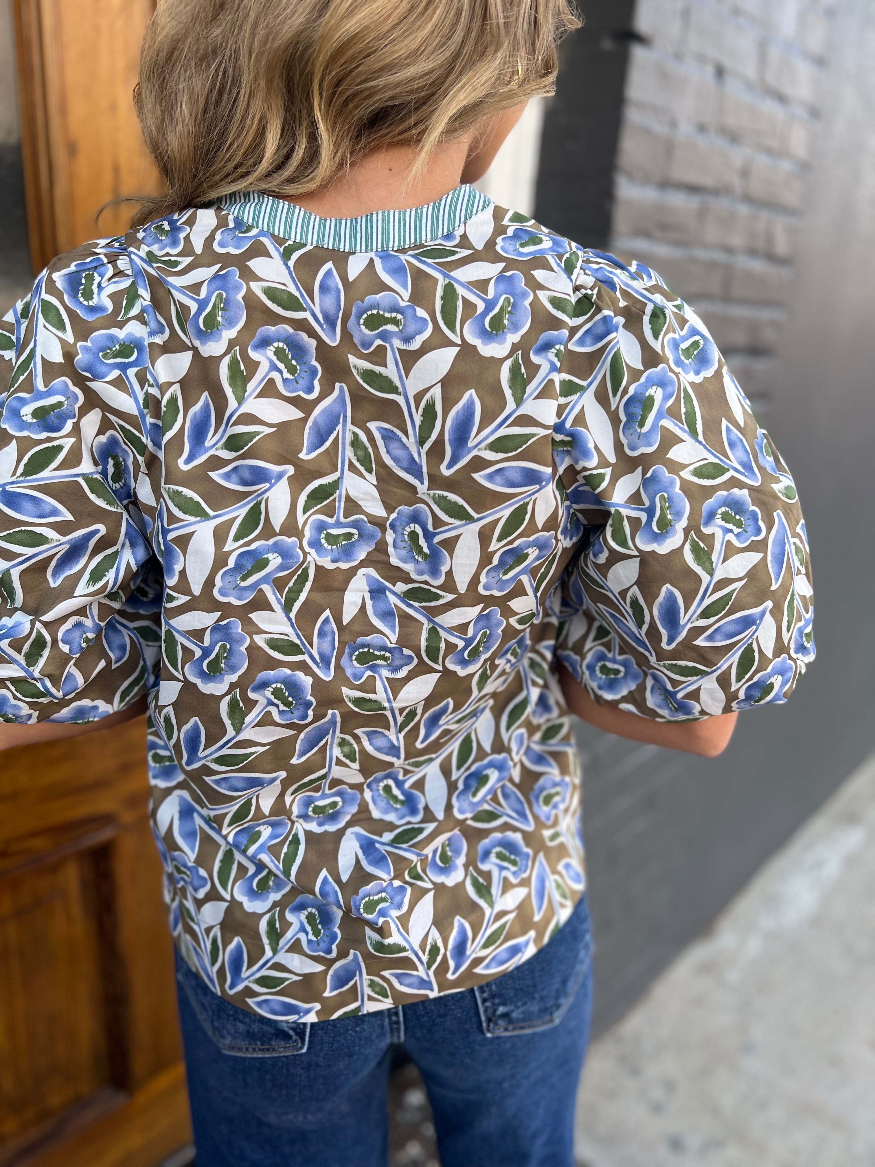 Elevate your wardrobe with The Botanical Top in Olive, featuring a vibrant botanical print that brings fresh energy to any outfit. Its striped notched neckline and puffed short sleeves with delicate pleating add a charming, feminine touch. Designed with a relaxed silhouette, this blouse offers both comfort and style, perfect for creating a playful yet polished look that stands out effortlessly.