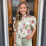 Elevate your wardrobe with The Casey Blouse in Pink, a charming floral print top designed for effortless style. Its short puff sleeves feature delicate pintuck detailing, complemented by a refined mock neck. The button-front closure adds practical elegance, while the lightweight woven fabric ensures comfort without sheerness. Perfect for warm days or layering, this blouse blends classic femininity with modern versatility.
