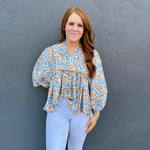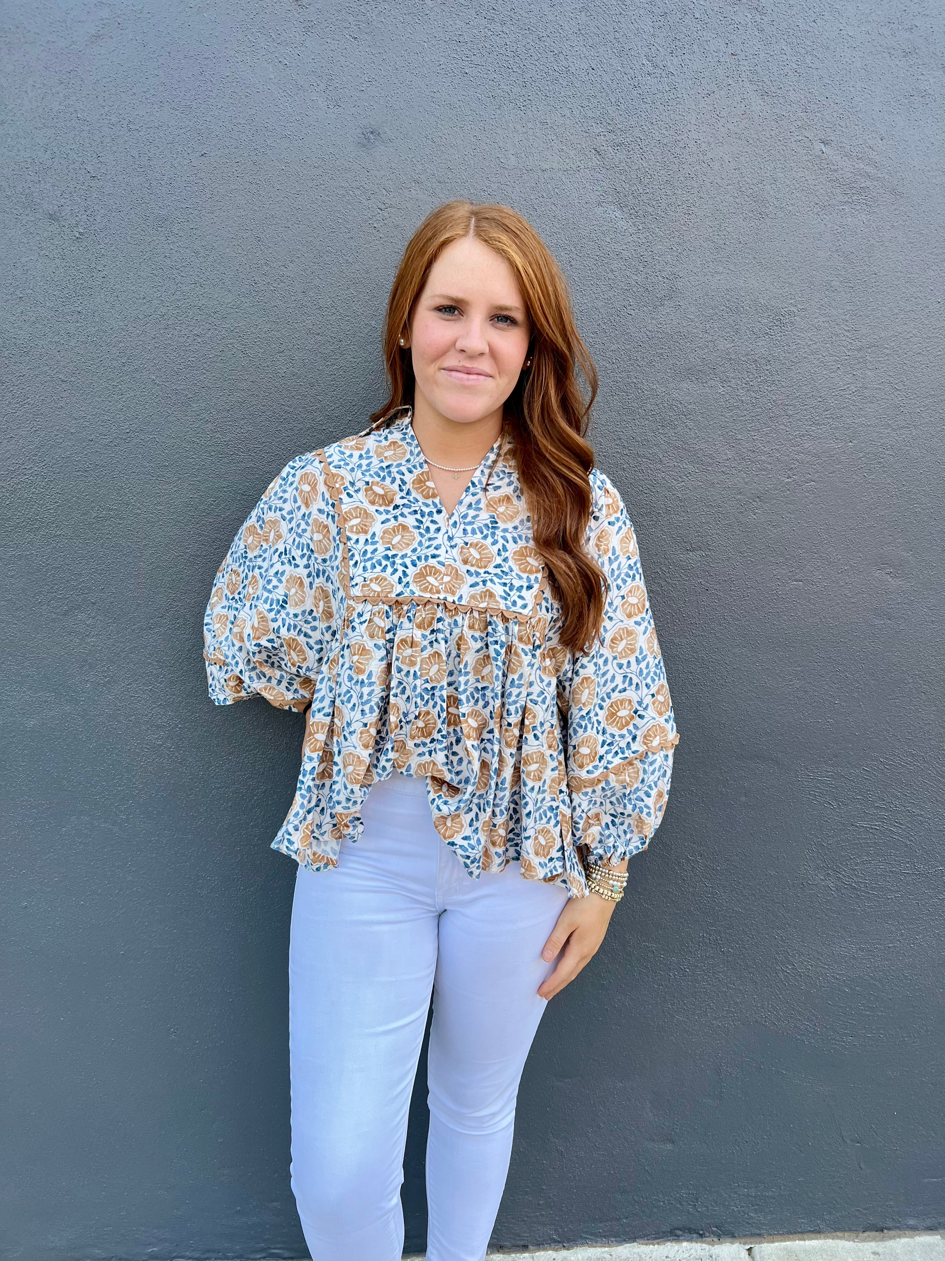 Embrace the changing season with The Chandler Blouse in Camel Mix. Featuring elegant 3/4 balloon sleeves and a flattering collar with a V neckline, this blouse is detailed with a unique square ric rac trim around the front and back bust. The cream background adorned with camel florals and blue leaves brings a fresh, nature-inspired look perfect for transitioning into fall. Stylish and comfortable, it’s an effortless way to refresh your wardrobe with seasonal charm.